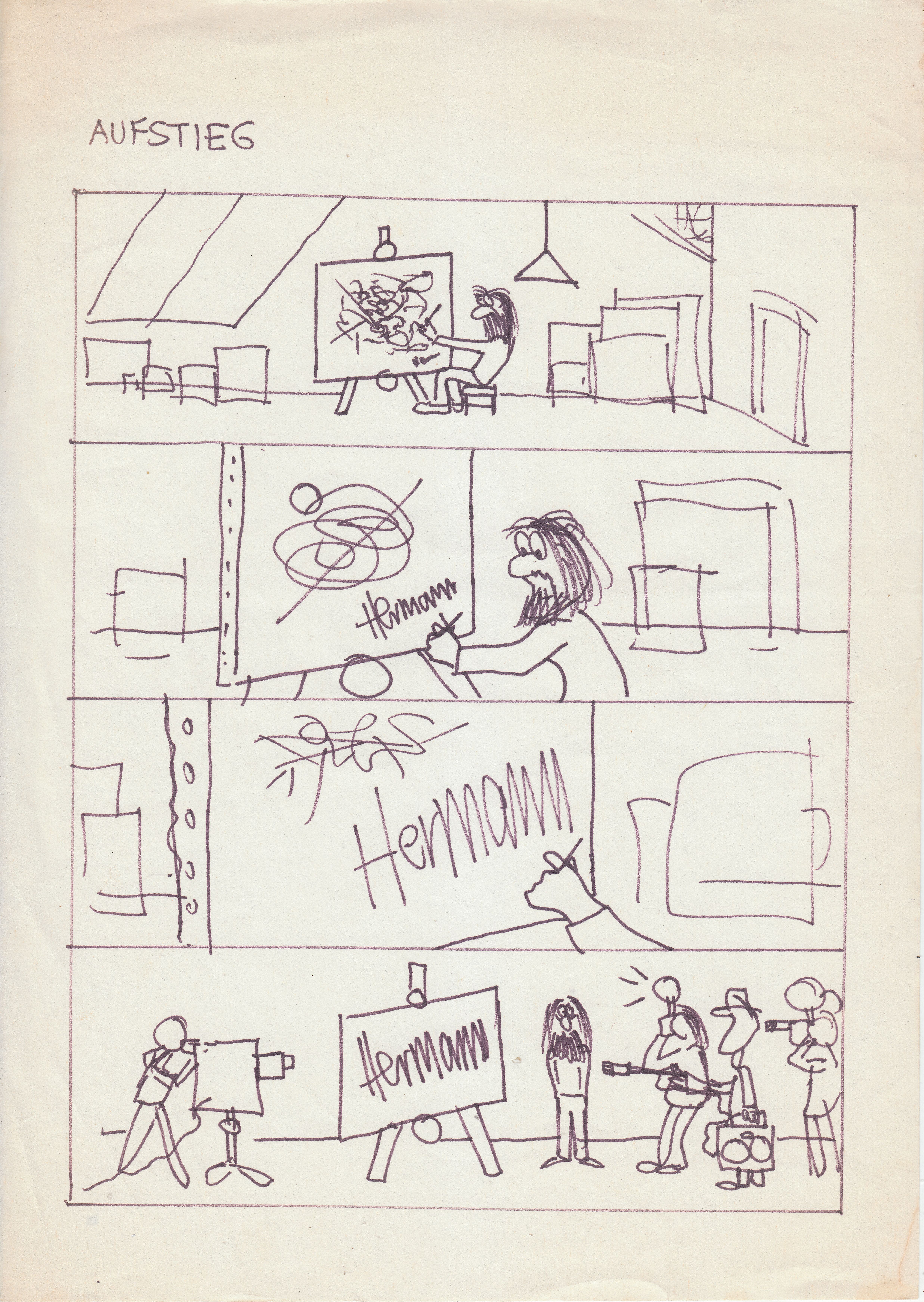 Dieses mit Filzstift gezeichnete Blatt ist eine Skizze für ein einseitiges Comic als Hommage an den hier bereits vorgestellten Comiczeichner Hermann, betitelt "AUFSTIEG":