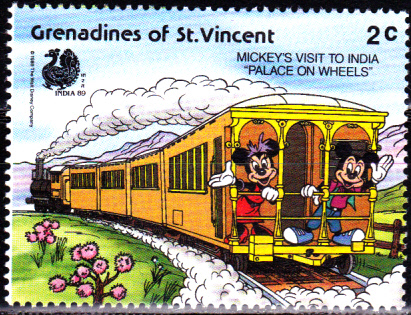 Auf dem zweiten Wert dieser Serie (MiNr 617) sehen wir Mickey Mouse und Minnie Mouse winkend im "Palast auf Rädern".