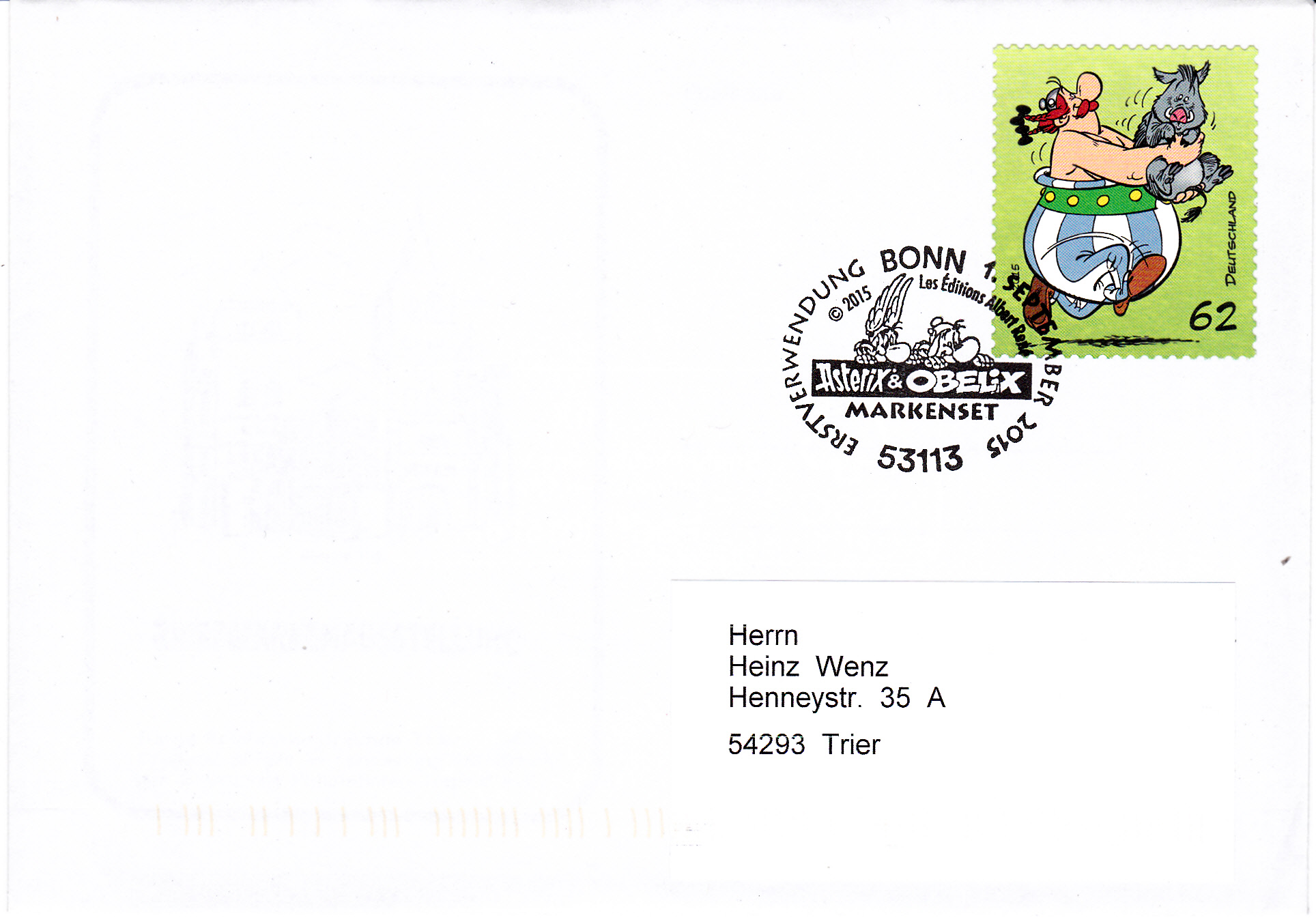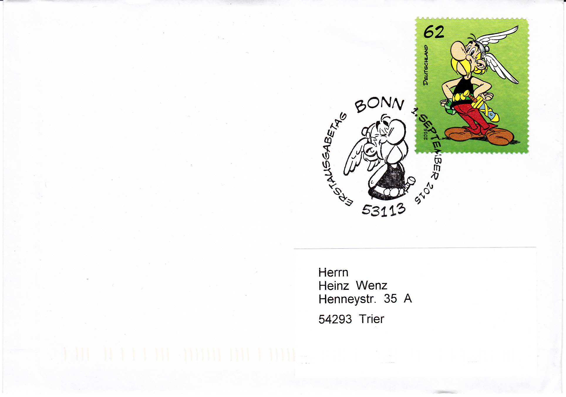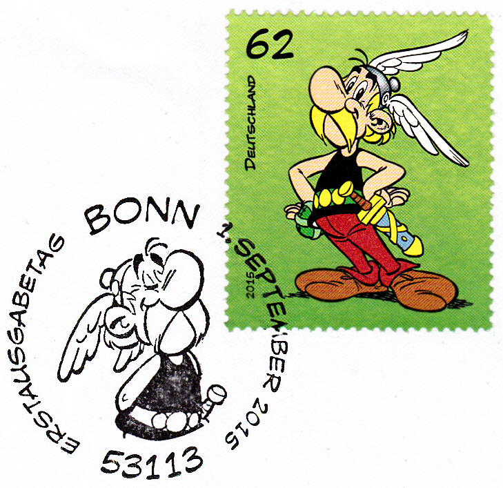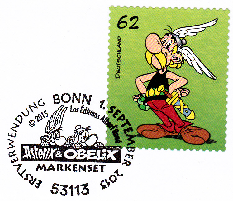Für die selbstklebenden Marken aus dem sogenannten "Markenset" wurde ein eigener "Ersttagstempel" ein sogenannter "Erstverwendungsstempel" Bonn zur Abstempelung am 1.9.2015 benutzt. Hier sind Asterix und Obelix gemeinsam im Stempelbild. Hier ein Brief mit der Asterix-Marke.