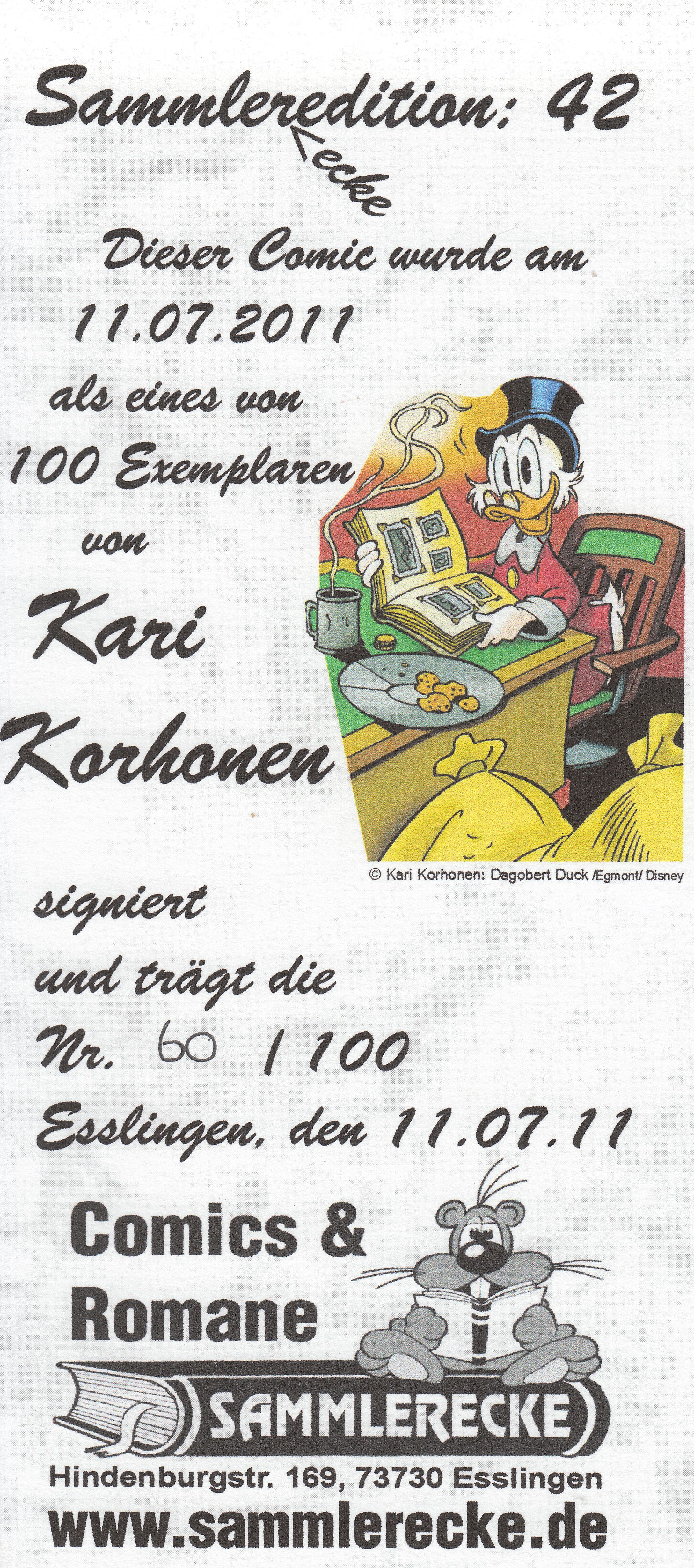 Dieses Hardcover "75 Jahre Donald Duck Superstar" wurde am 11.07.2011 von Kari Korhonen signiert: