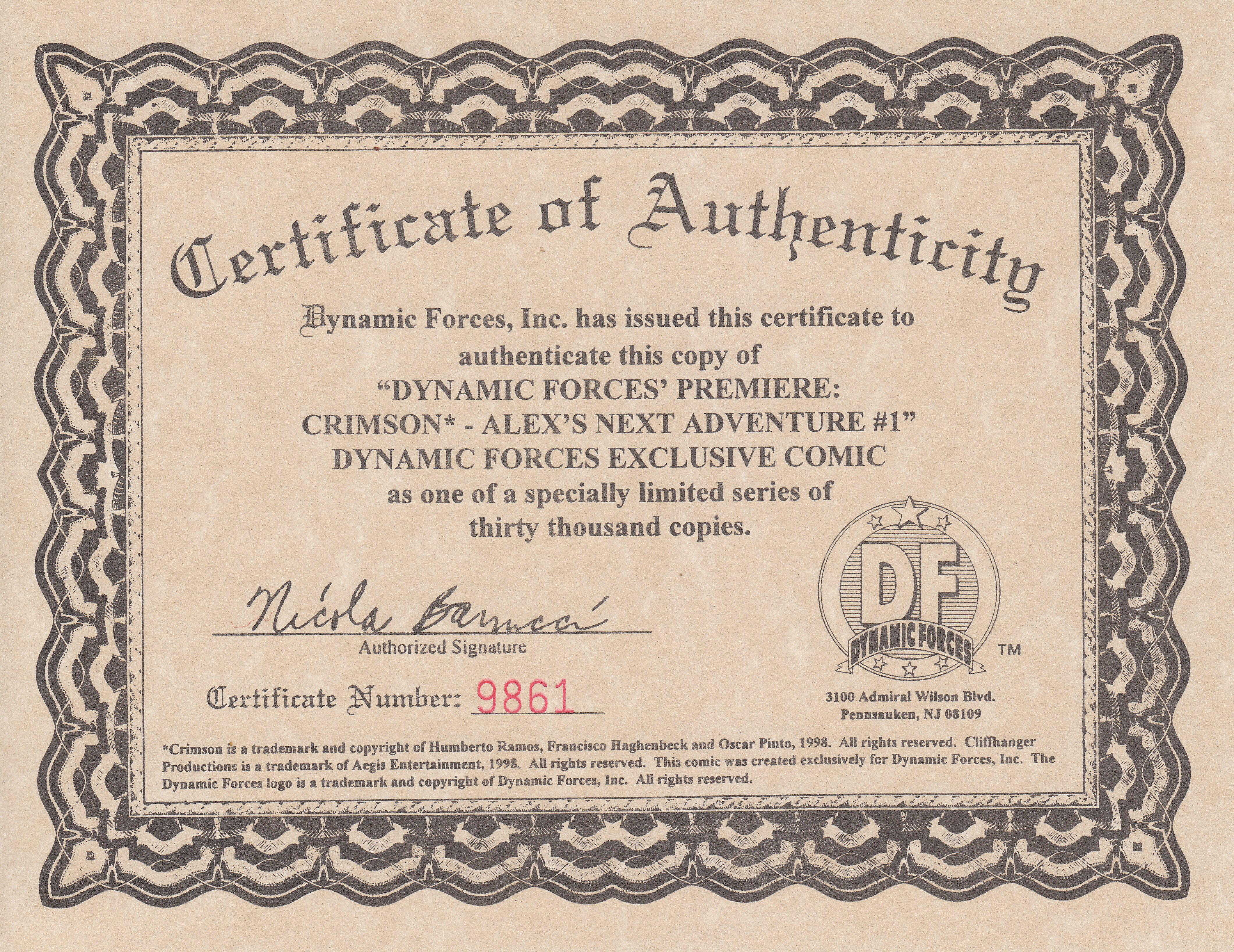 Hier das Exemplar mit Zertifikat Nummer 9861 der auf 30.000 Stück limitierten "DYNAMIC FORCES' PREMIERE: CRIMSON - ALEX'S NEXT ADVENTURE #1":