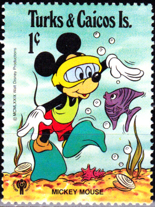Am 2. Nov. 1979 erschien auf den Turks- und Caicos-Inseln eine Serie zum Internationalen Jahr des Kindes mit Walt-Disney-Figuren. Auf der MiNr 466 sehen wir Mickey Mouse als Taucher.