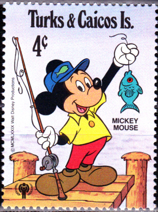 Auf der MiNr 469 aus der gleichen Serie der Turks- und Caicos-Inseln präsentiert Mickey Mouse einen gefangenen Fisch.