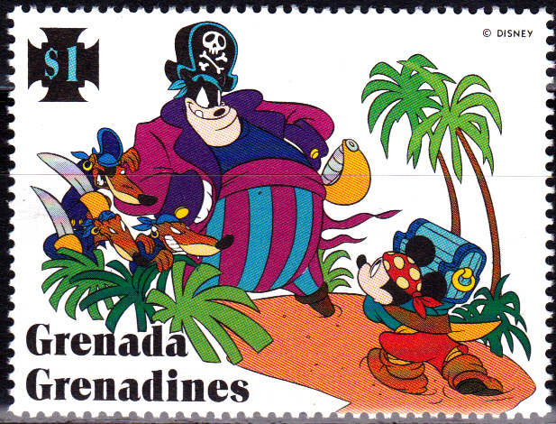 Auf einer weiteren Marke dieser Serie "Die Suche nach dem Piratenschatz" aus Grenada/Grenadinen (MiNr 2123) sehen wir wie Mickey Mouse eine Schatzkiste zu dem Piraten Kater Carlo schleppt.