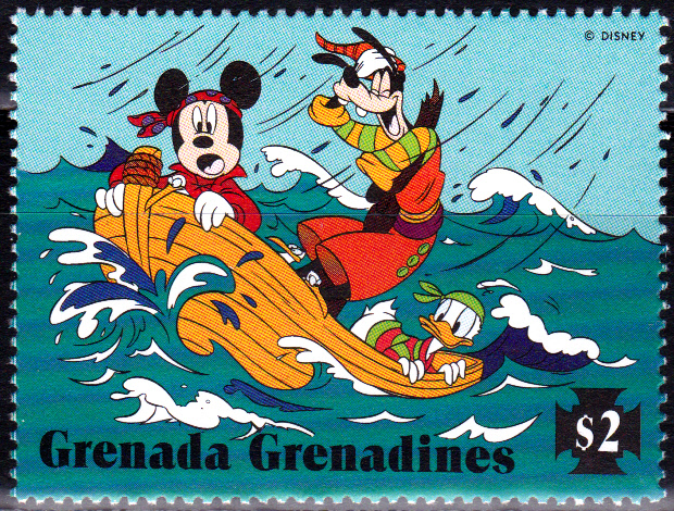 Diese Marke aus Grenada/Grenadinen (MiNr 2120) zeigt ein Bild aus "Die Suche nach dem Piratenschatz". Hier sehen wir Mickey Mouse und Minnie Mouse am Steuerrad eines Schiffes.