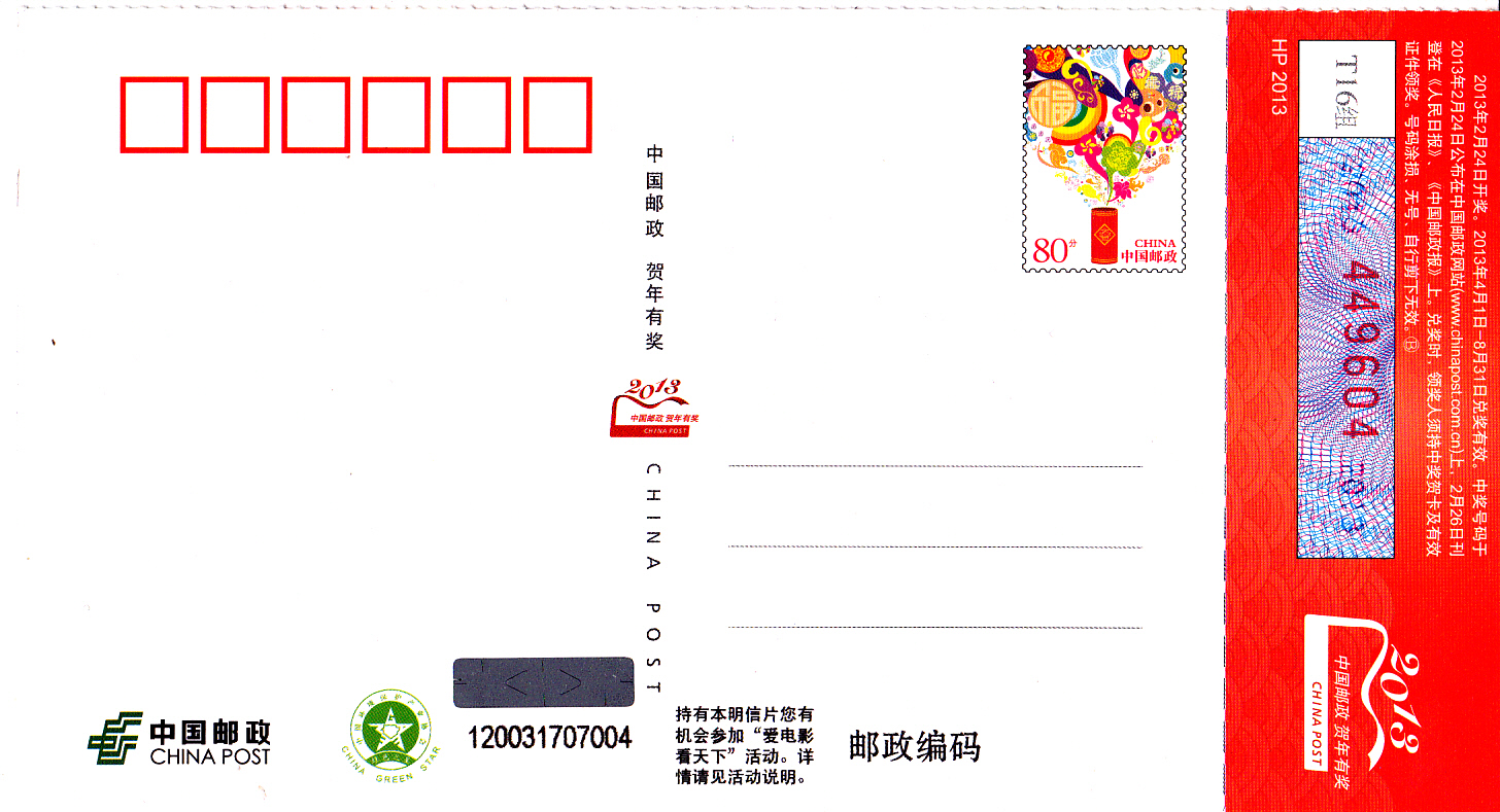 Diese Ganzsache aus China zeigt auf der Bildseite Mickey Mouse, Minnie Mouse, Donald Duck, Daisy Duck, Pluto und Goofy. Sie wurde mit einer selbstklebenden Marke beklebt, am Ausgabetag mit dem Erstverwendungsstempel gestempelt und so als Maximumkarte verwendet. Auf der Anschriftenseite sehen wir, dass dort auch eine Losnummer zur Lotterieteinbahme zu finden ist.