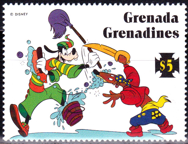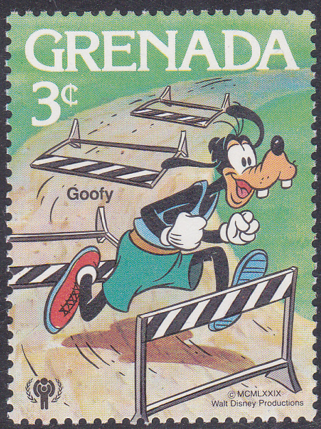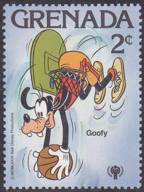 Goofy wird auf dieser Marke aus Grenada (MiNr 993) aus einer Serie zum Internationalen Jahr des Kindes als Basketballspieler gezeigt. Er ist dabei selbst im Korb gelandet.