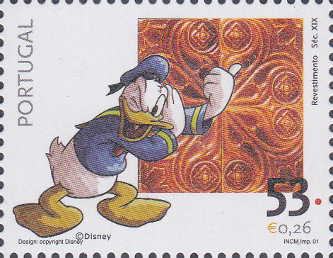 Hier zeige ich eine Marke (MiNr 1155) zur Szene "Ein armer Bauer (dargestellt durch Donald Duck) fährt mit zwei Ochsen ein Fuder Holz in die Stadt".