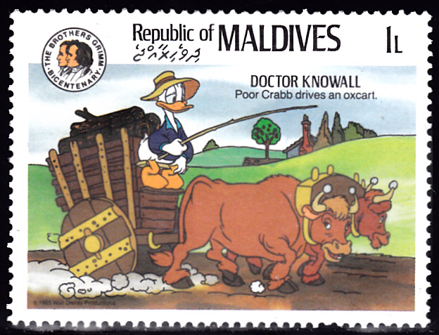 Zum 200. Geburtstag der Brüder Grimm sind in einer Serie auf den Malediven Marken mit Illustrationen zu "Doktor Allwissend" mit Walt-Disney-Figuren erschienen.