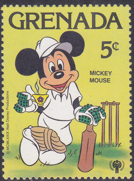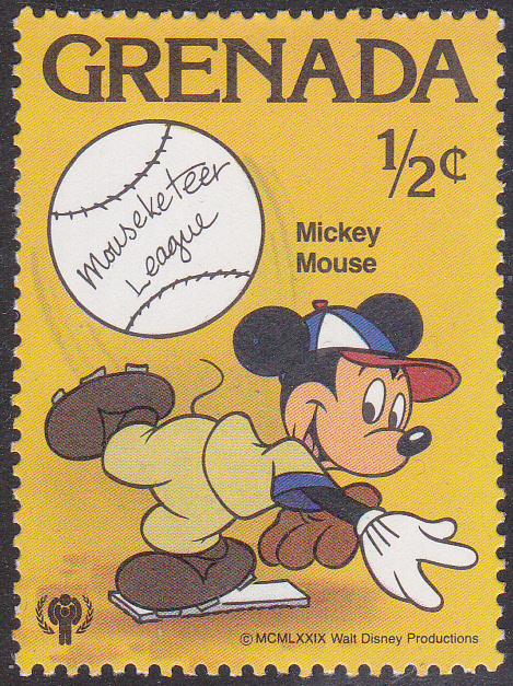 Mickey Mouse ist auf dieser Marke aus Grenada (MiNr 991) zum Internationalen Jahr des Kindes als Werfer (heißt dann Pitcher) beim Baseball (Pitcher) oder beim Cricket (heißt dort Bowler) zu sehen.
