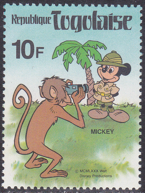 In Togo ist 1980 in einer Serie "Walt-Disney-Welt" diese Marke (MiNr 1473) erschienen. Auf der Marke fotografiert ein Affe Micky Mouse.