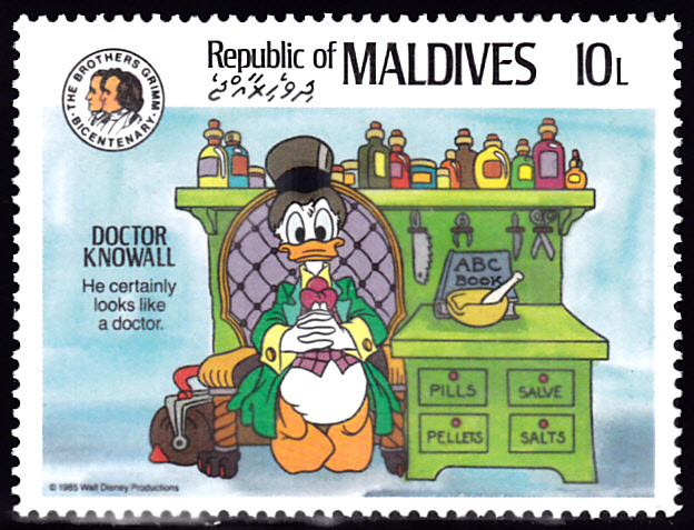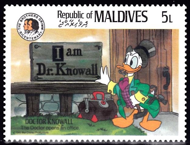 Diese Marke (MiNr 1156) zeigt die Szene "Doktor Allwissend (Donald Duck) eröffnet eine Praxis".