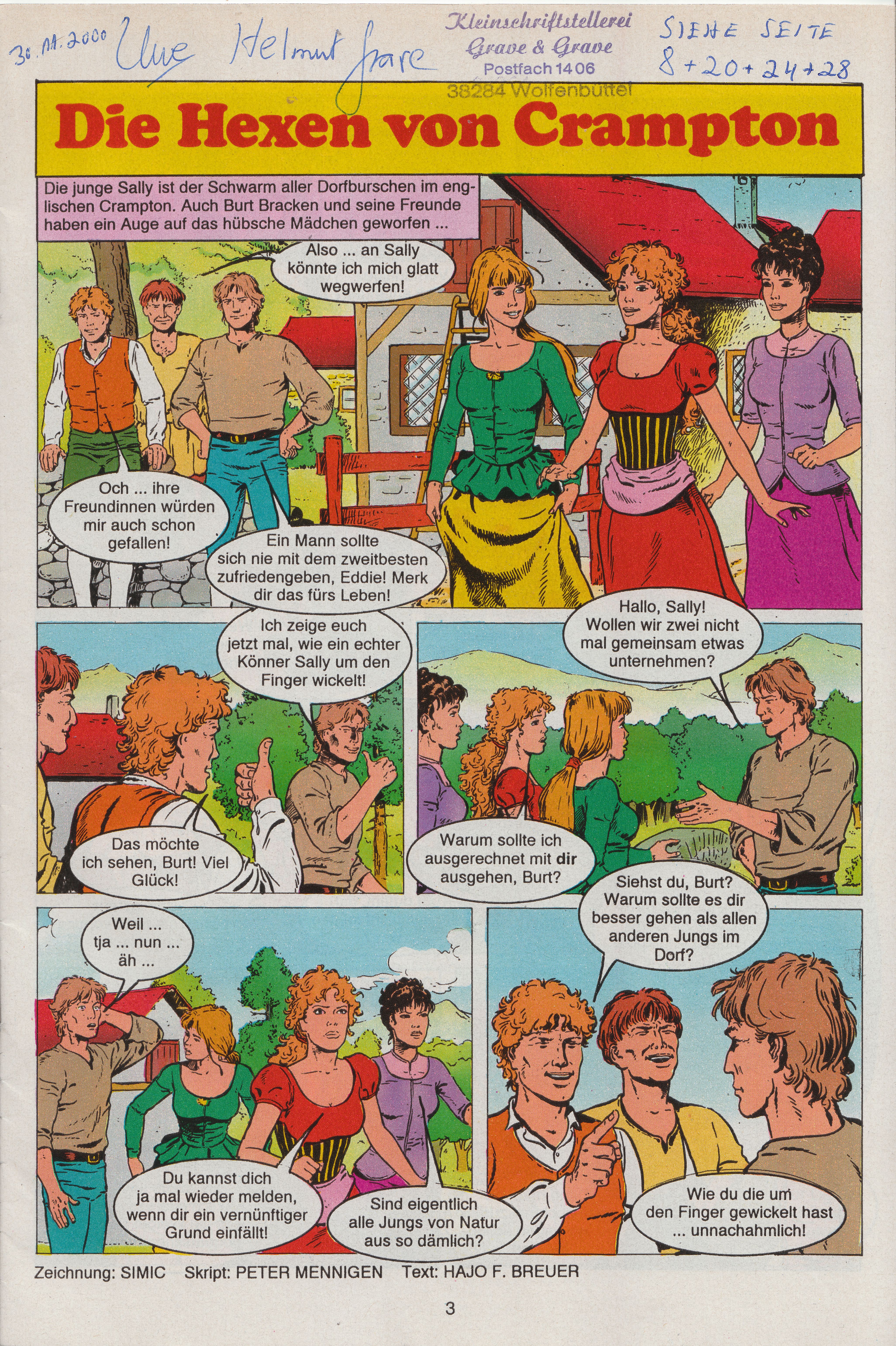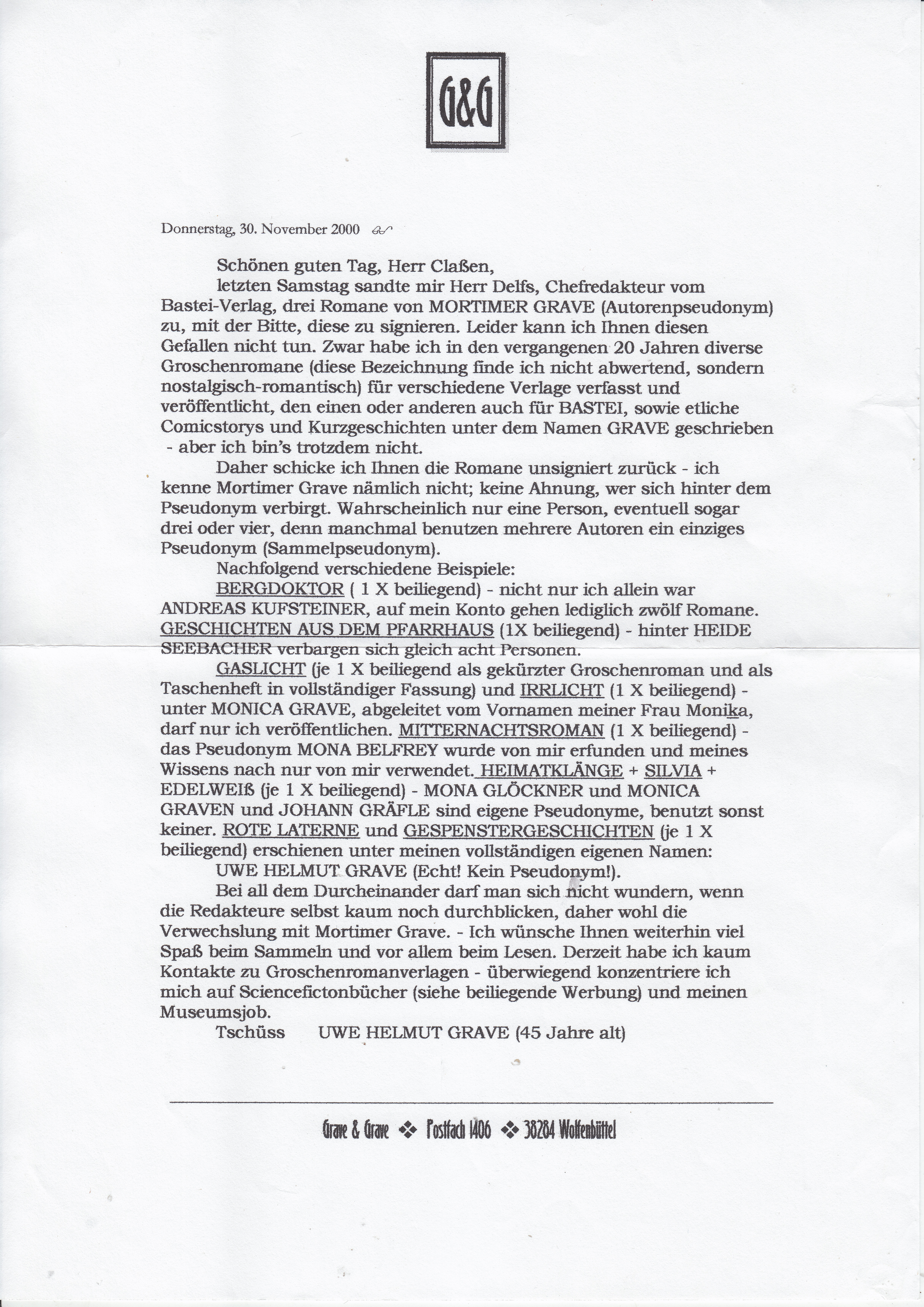 Laut dieser Beilage hat Uwe Helmut Grave dieses signierte Heft einem Herrn Claßen geschenkt, der ihn gebeten hatte, als Mortimer Grave zu signieren: