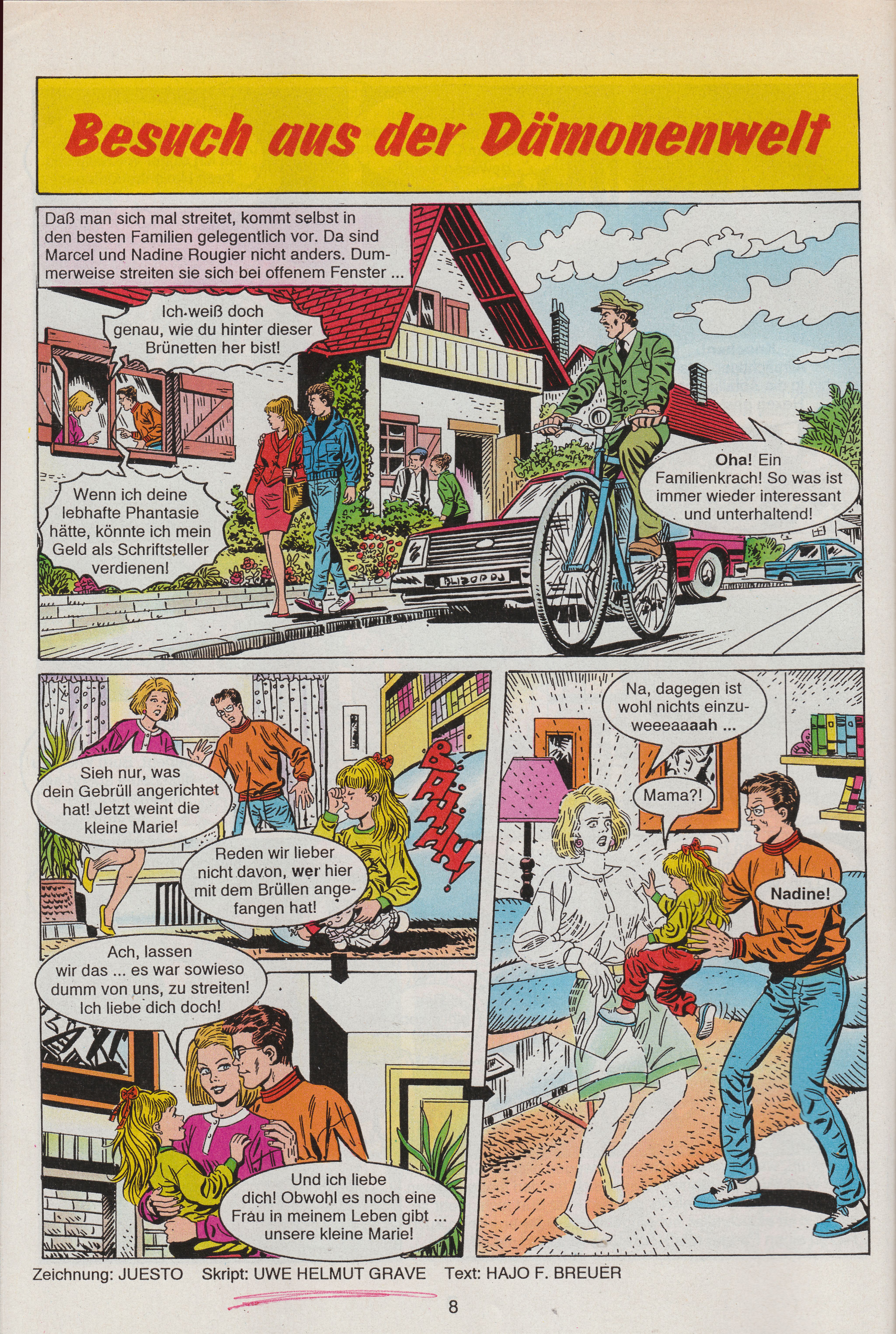 Das fertige Szenario bekam dann der Zeichner, der nunmehr die Bilder anfertigte, was vonnöten war, weil ich nämlich nicht zeichnen kann und weil Bilder in Comicheften laut einem uralten Aberglauben nahezu unverzichtbar sind. Anschließend fügte der Texter – mein Freund Hajo F. Breuer, der wie ich kurz vor seinem Sechzigsten starb, aber leider nicht mehr zurückkehrte – die Sprechblasen ein. Unser aller Geschichten erschienen dann unter den Labels Gespenstergeschichten Spukgeschichten in Form von Heften, Taschenbüchern und großformatigen Sonderausgaben. Lang, lang ist’s her. Autoren und Zeichner gab es mehrere (ich war einer von beiden Hauptautoren), getextet hat fast immer Hajo."