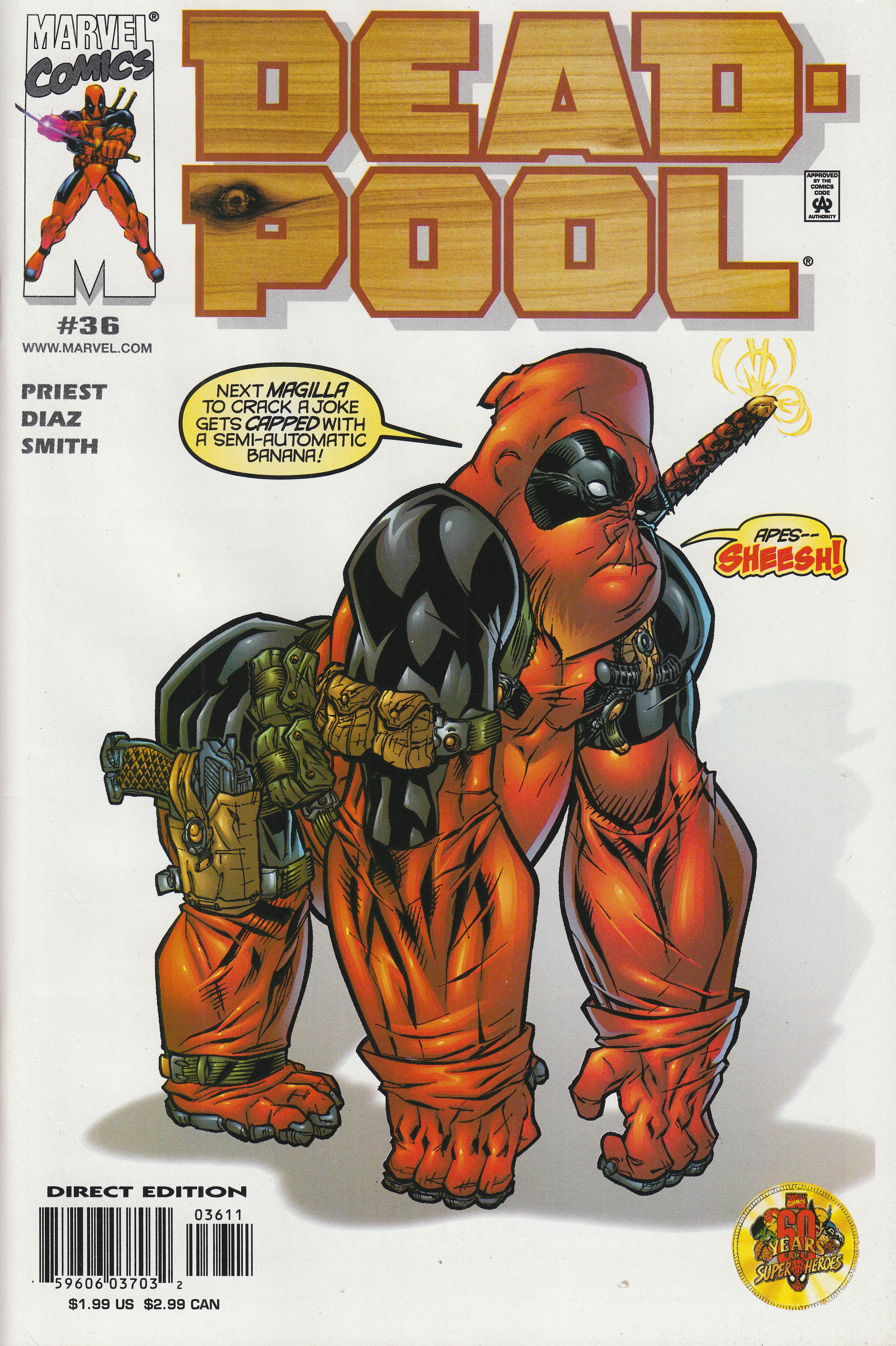 Das Titelbild dieses Comicheftes DEADPOOL Vol. 1 No. 36 zeigt Deadpool als Gorilla: