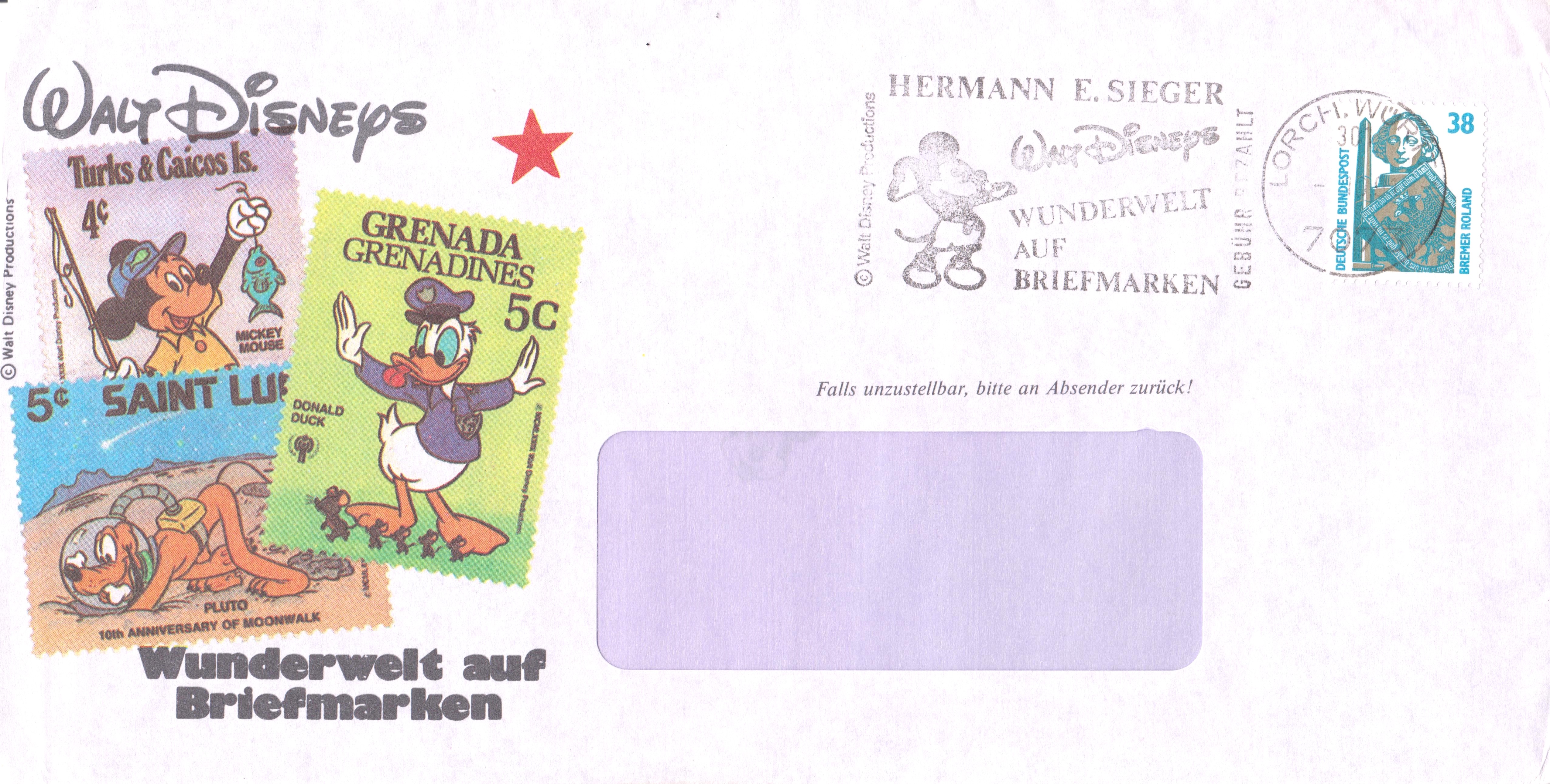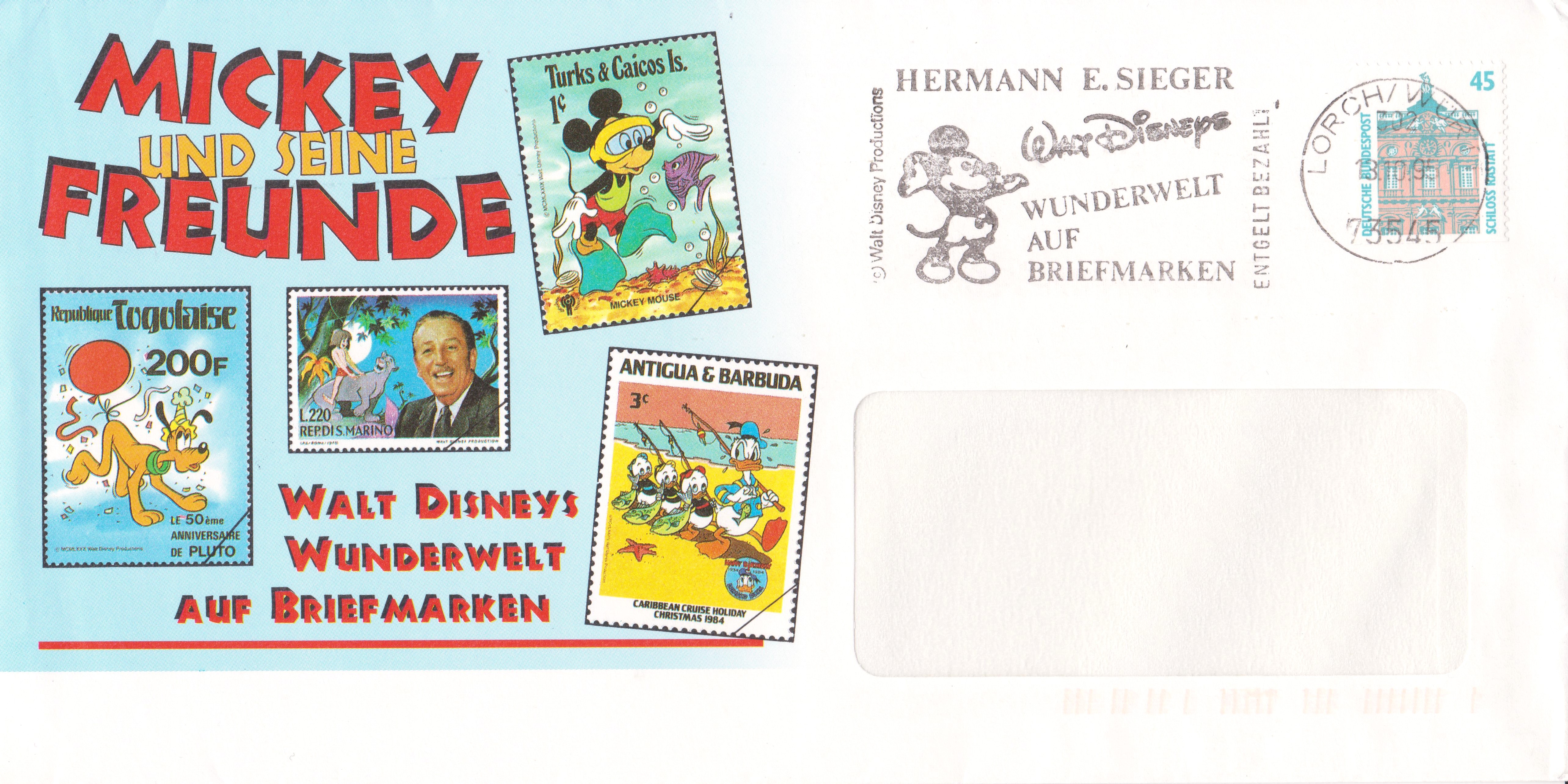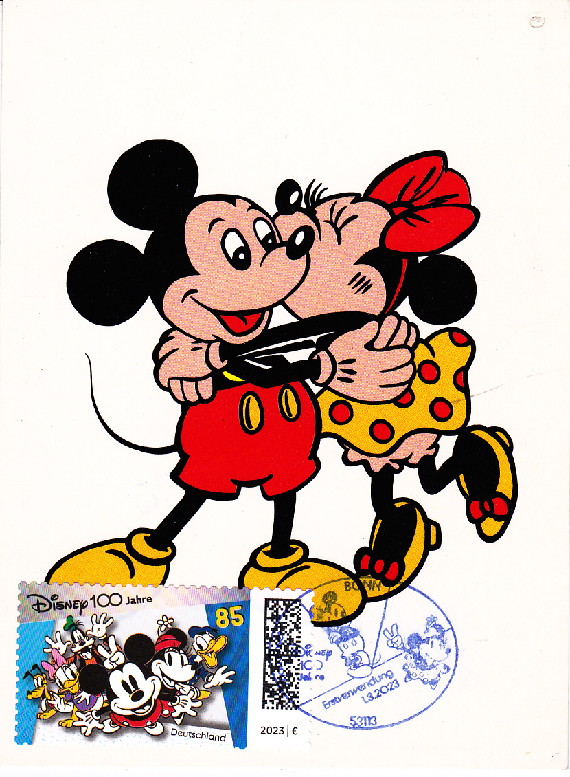 Eine weitere Ganzsache aus China zeigt auf der Bildseite Mickey Mouse und Minni Mouse auf der Bildseite. Sie wurde ebenfalls mit einer selbstklebenden Marke beklebt, am Ausgabetag mit dem Erstverwendungsstempel gestempelt und so als Maximumkarte verwendet. Auf der Anschriftenseite sehen wir, dass dort auch eine Losnummer zur Lotterieteinbahme zu finden ist.