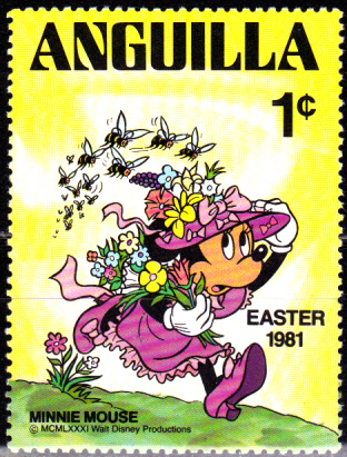Zu Ostern verausgabte Anguilla diese Marke zu 1 Cent (MiNr 432) mit der Abbildung von Minnie Mouse mit einem Osterstrauß.