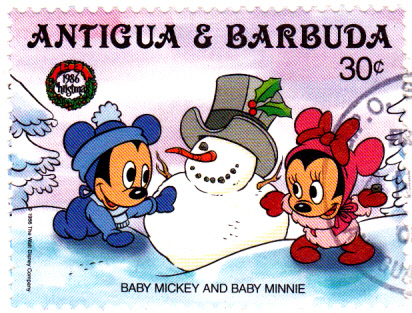 Auf der Marke zu 30 Cent aus der Weihnachtsserie 1986 von Antigua und Barbuda bauen Minnie Mouse und Mickey Mouse (jeweils dargestellt als Baby) einen Schneemann.