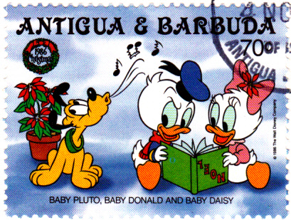 Pluto, Daisy Duck, Donald Duck (alle drei als Baby) singen auf der Marke zu Weihnachten 1986 aus Antigua und Barbados (MiNr 999) zusammen Weihnachtslieder.