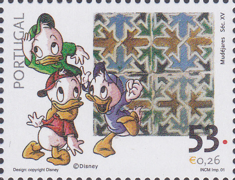 In der Serie "100. Geburtstag von Walt Disney" aus Portugal werden Walt-Disney-Figuren und Azulejos abgebildet. Hier eine der Marken (MiNr 2541) mit Tick, Trick und Track.