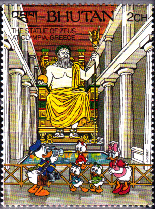 Diese Marke aus Bhutan (MiNr 1381) aus der Serie zum Thema "Weltwunder und Sehenswürdigkeiten mit Walt-Disney-Figuren" zeigt Tick, Trick und Track zusammen mit Daisy Duck und Donald Duck vor der Zeusstatue in Olympia.
