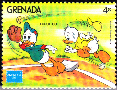 Zur Internationale Briefmarkenausstellung AMERIPEX ’86 in Chicago erschien in Grenada eine Markenserie mit Walt-Disney-Figuren beim Baseball. Auf dem Wert zu 4 Cent (MiNr 1474) sehen wir Tick und Trick bei einem sogenannten "Force out".