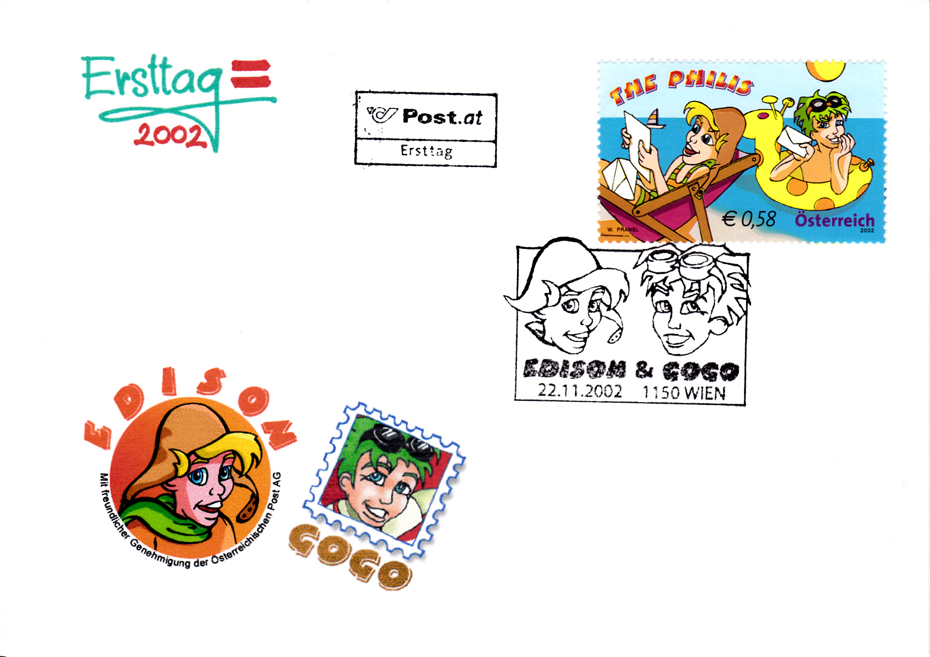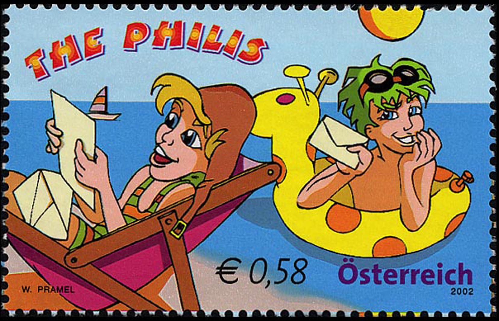 Bei der Post in Österreich erschienen dazu Briefmarken. Hier eine Marke (MiNr 2372) die Mel und Lucy beim Briefeschreiben zeigt.