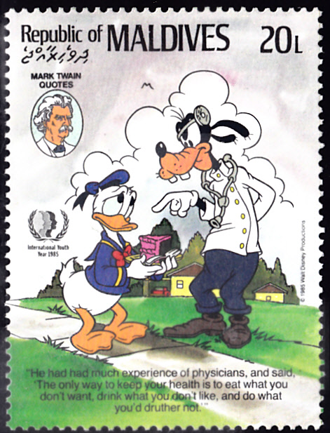 Auf den Malediven ist eine Serie "150. Geburtstag von Mark Twain und Internationales Jahr der Jugend" mit Illustrationen durch Walt-Disney-Figuren zu Zitaten von Mark Twain erschienen. Diese Marke (MiNr 1151) zeigt eine Illustration mit Donald Duck und Goofy. Das Zitat von Mark Twain ist am unteren Markenrand nachzulesen.