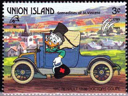 In St. Vincent Grenadinen, Union Island erschien am 7. Juli 1989 zum 200. Jahrestag der Französischen Revolution und zur Internationalen Briefmarkenausstellung PHILEXFRANCE ’89 in Paris eine Serie mit Walt-Disney-Figuren in historischen Automobilen. Union Island ist mit 8 km² eine der südlichsten Inseln der Grenadinen und Teil des Staates St. Vincent und die Grenadinen. Auf der Insel leben ca. 5.000 Einwohner.