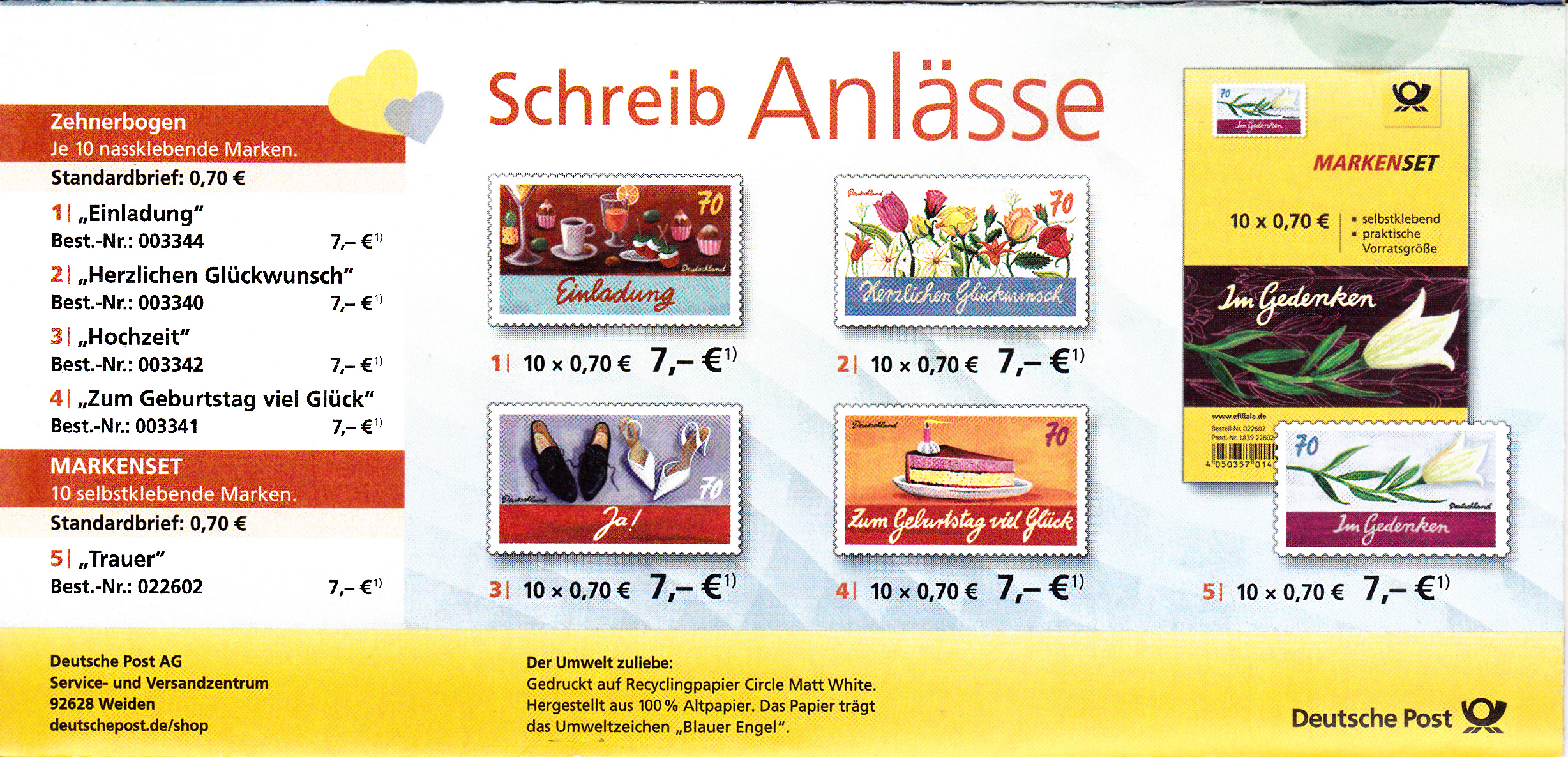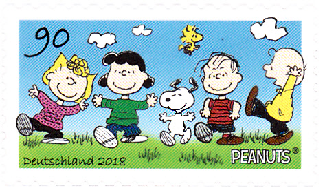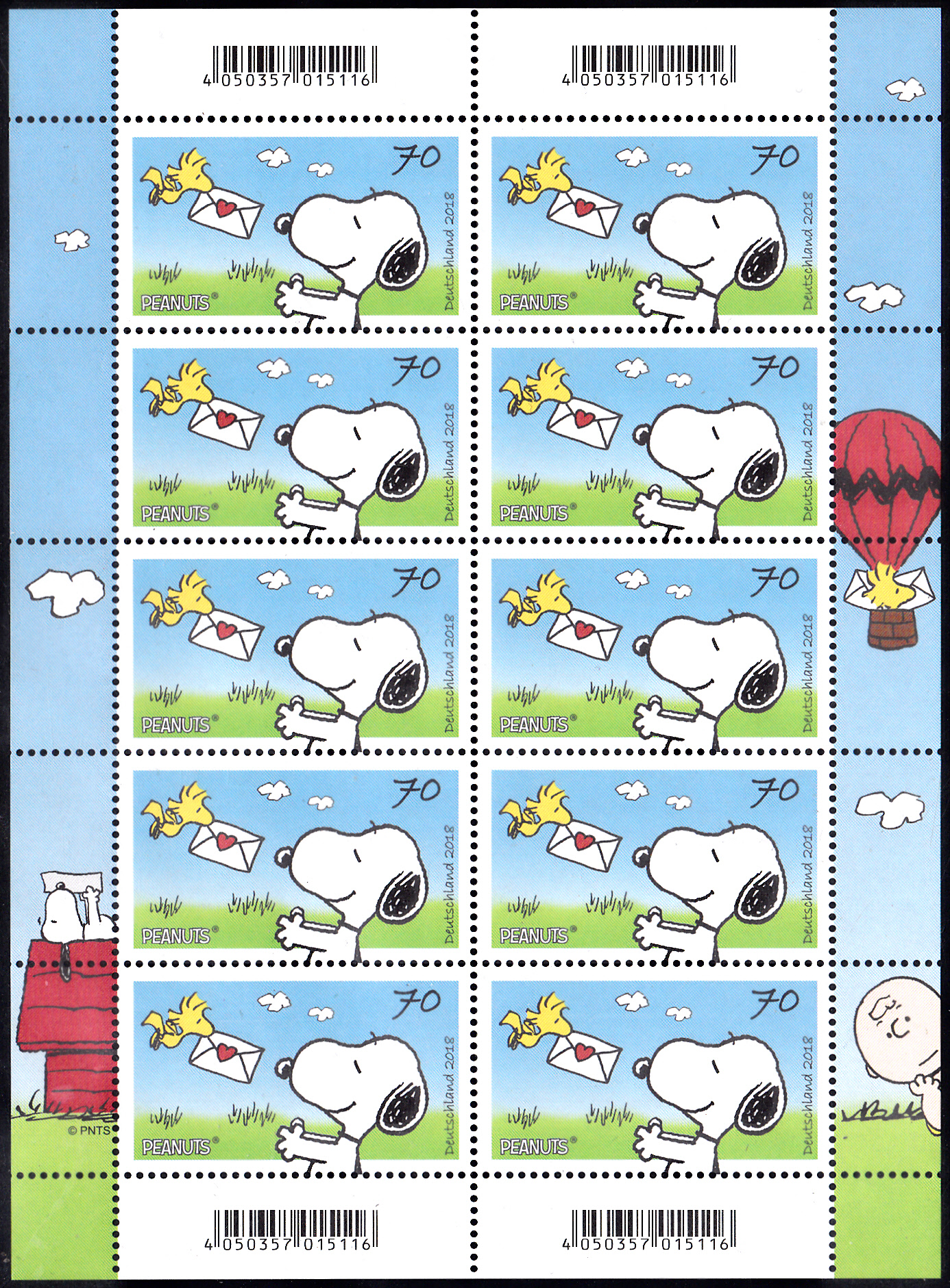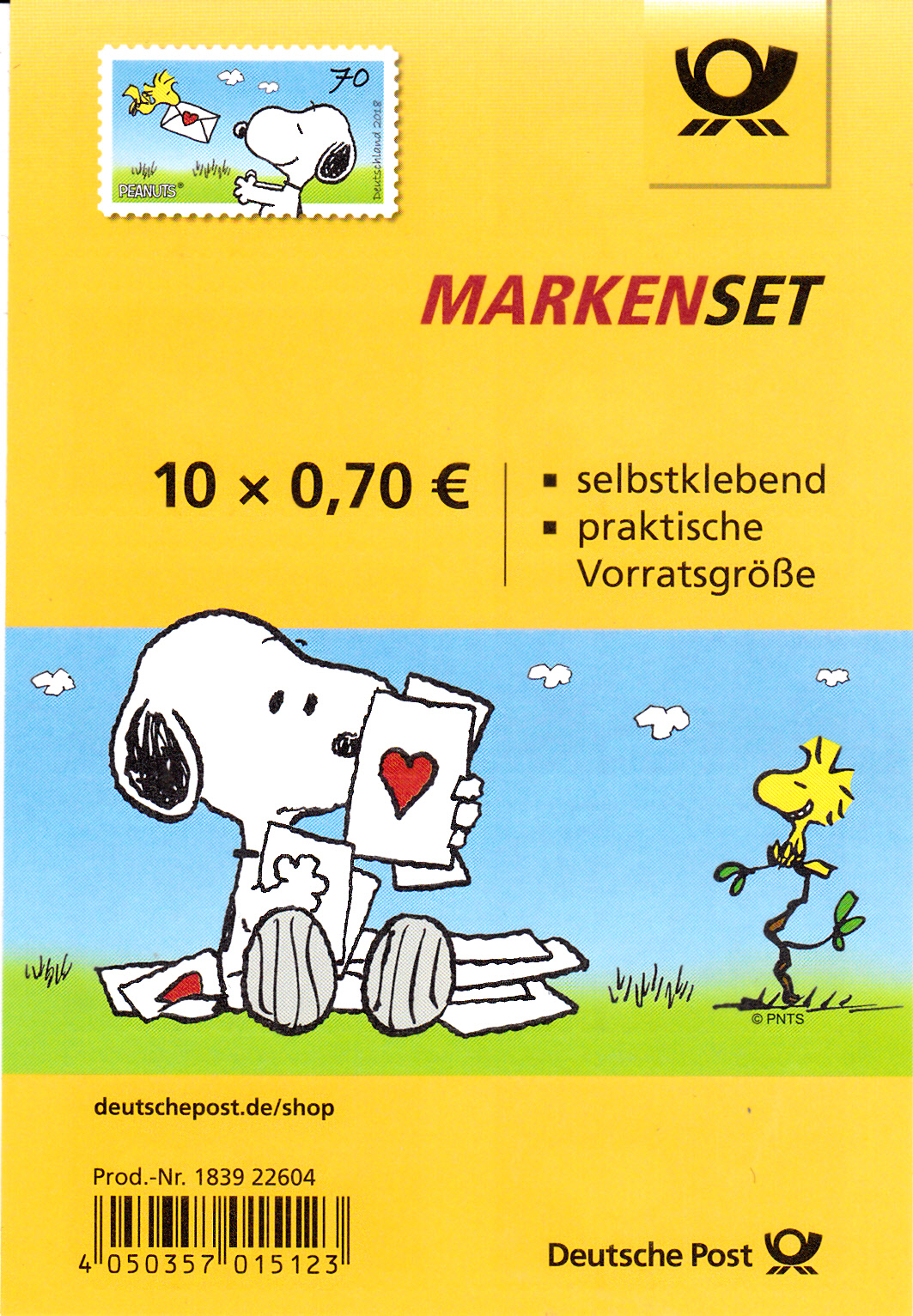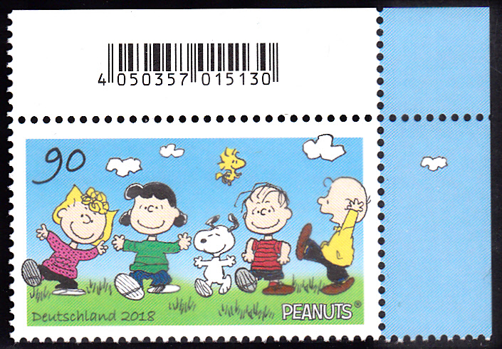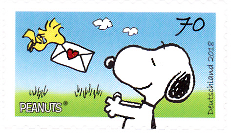 Auf dieser Marke der Deutschen Post zu 70 Cent (MiNr 3369) überbringt Woodstock, ein kleiner gelber Vogel, Snoopy, Charlie Browns Haushund, einen Liebesbrief. Hier eine Marke vom Eckrand mit EN-Code.