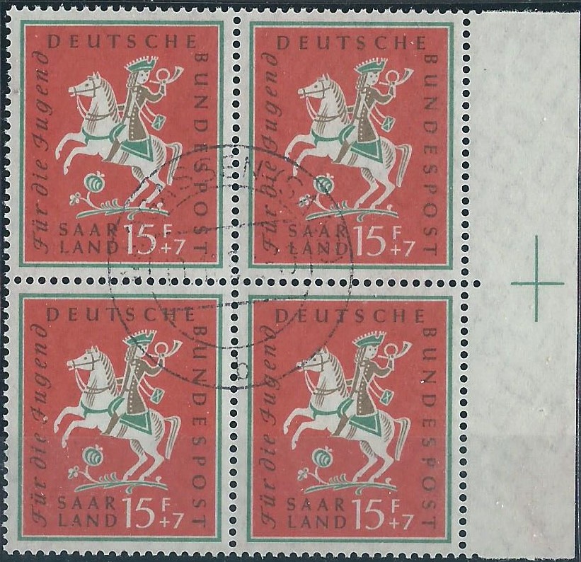 Den Anfang macht ein 4-er-Block vom linken Bogenrand der Ausgabe „Waldbrandverhütung“. Diese mit der Bundesrepublik motivgleiche Marke hat hier die Michel-Nummer 431 und diese Einheit wurde am 5.3.58 in Saarbrücken gestempelt.