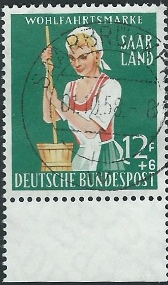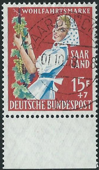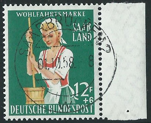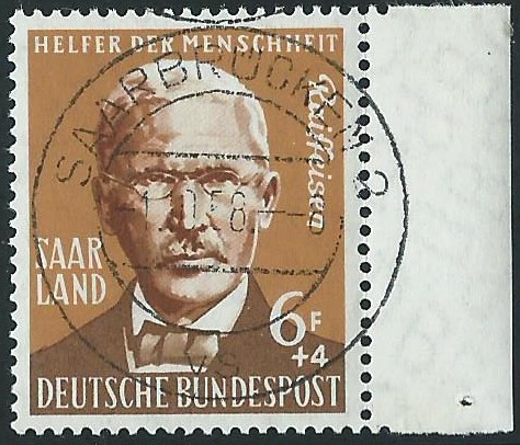 Der Satz Wohlfahrt 1958 (Mi.Nr. 441 – 444) ist auch in einigen Bogenrändern vorhanden. Den Anfang macht der Wert zu 6 + 4 Fr. als rechtes Seitenrandstück mit Stempel Saarbrücken vom 1.10.58: