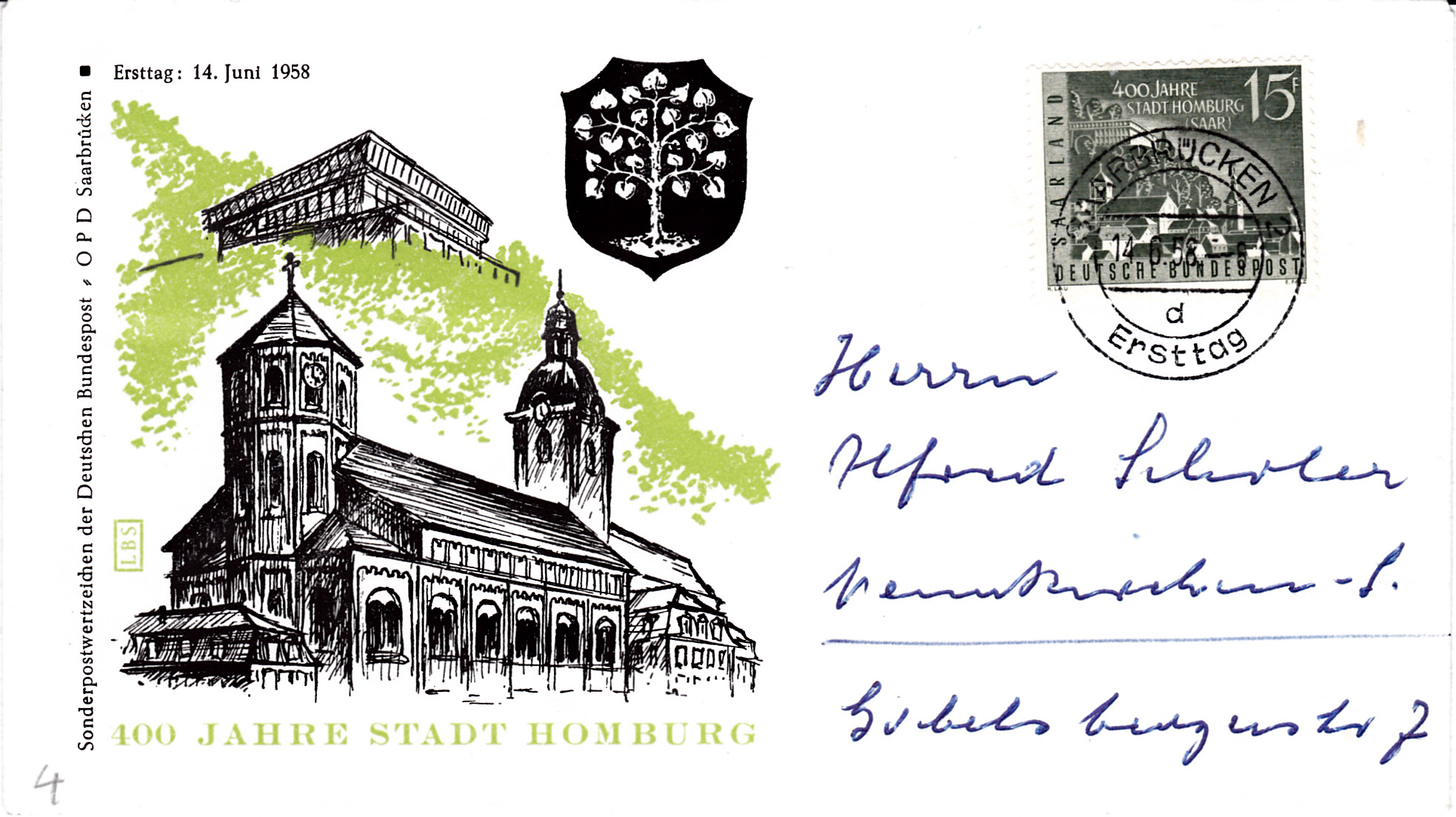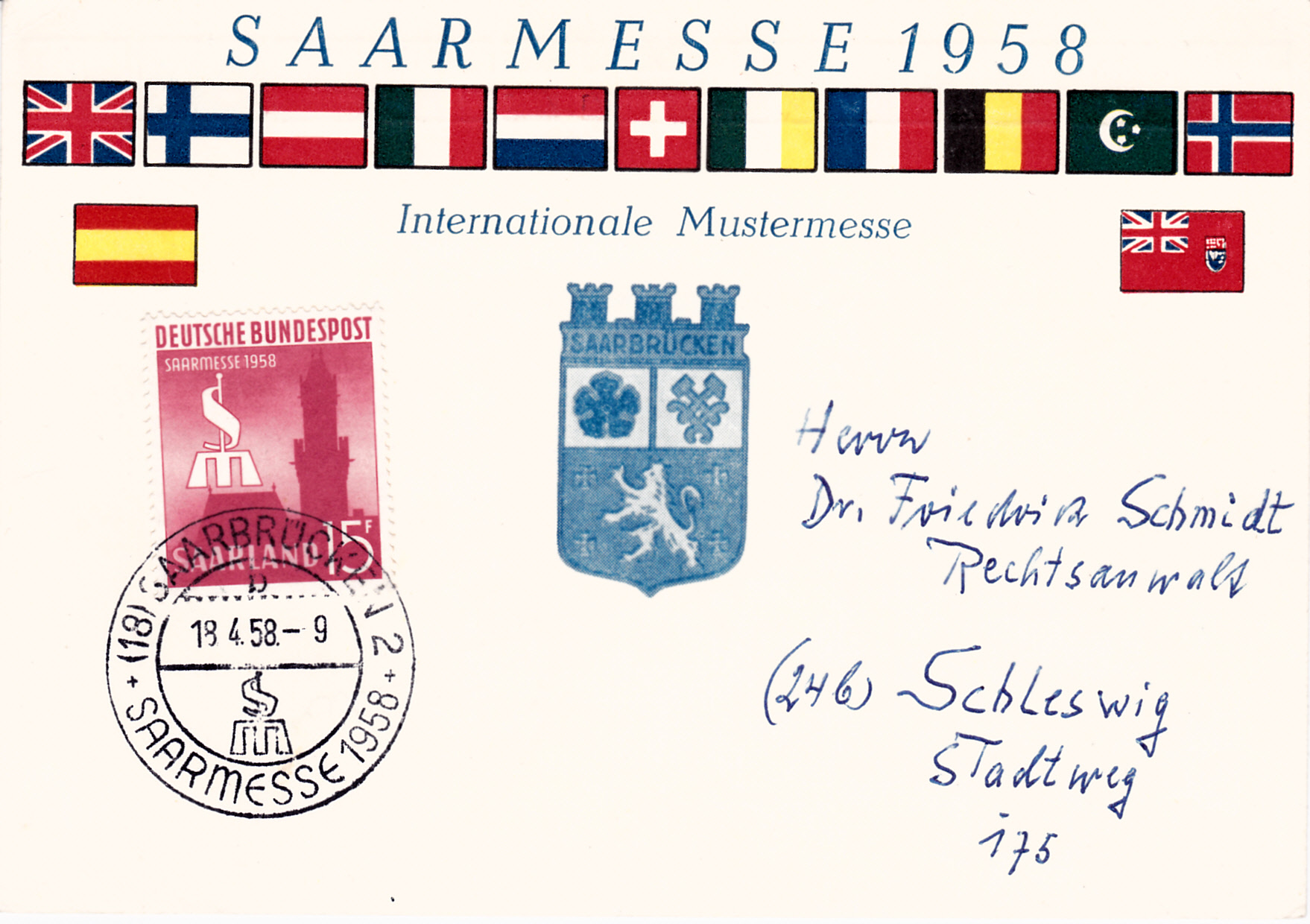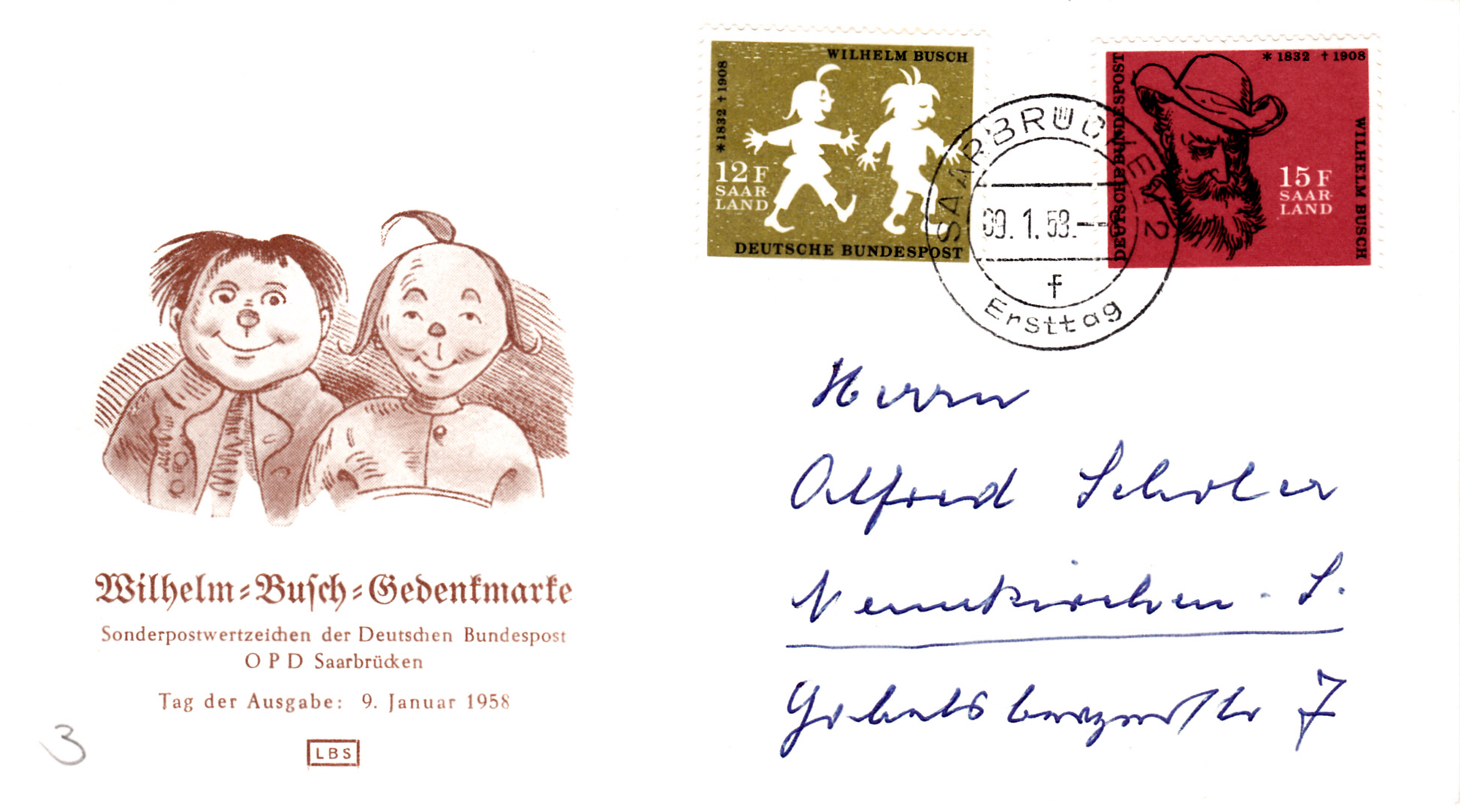 Hier will ich noch ein paar Ergänzungen anfügen. Als erstes einen FDC mit der Marke "Eingliederung des Saarlandes in die Bundesrepublik Deutschland" mit dem Ersttagstempel mit dem Kennbuchstaben "c" wie im vorhergehenden Beitrag von Rüdiger.