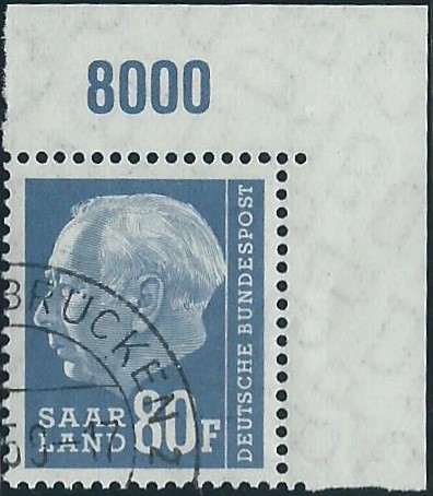 Der Wert zu 80 Fr. aus der rechten oberen Bogenecke mit Stempel Saarbrücken aus 59