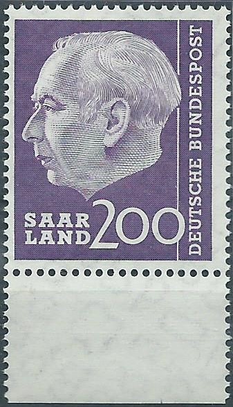 Und Heuss ohne F 12 Fr als waagerechter 5-er-Streifen vom Unterrand. Interessant hierbei ist ein sogenannter Klischee-Versatz zwischen der 2. Und 3. Marke von links. Die Walzenstriche stehen links etwas höher als auf dem rechten Feld. Das passiert immer zwischen Feld 5 und 6 im Oberrand und zwischen Feld 95 und 96 im Unterrand. Die Klischees auf der Druckplatte sind immer im fünfer-Satz nebeneinander gehalten, daher kommen die Unterschiede mal mehr und mal weniger stark sichtbar zustande.