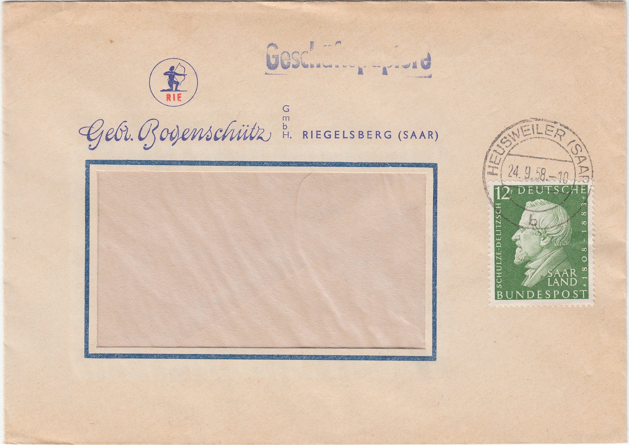 EF der MiNr. 438 am 24.09.1958 auf Sendungsart "Geschäftspapiere":