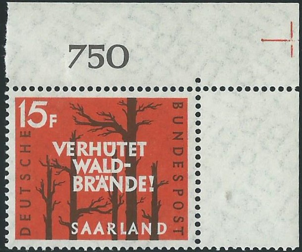 Den Anfang macht die Ausgabe „Waldbrandverhütung“. Diese mit der Bundesrepublik motivgleiche Marke hat hier die Michel-Nummer 431. Zeigen kann ich ein rechtes oberes Bogeneckrandstück, auf dem rechts oben in der äussersten Ecke noch ein Passerkreuz zu sehen ist.