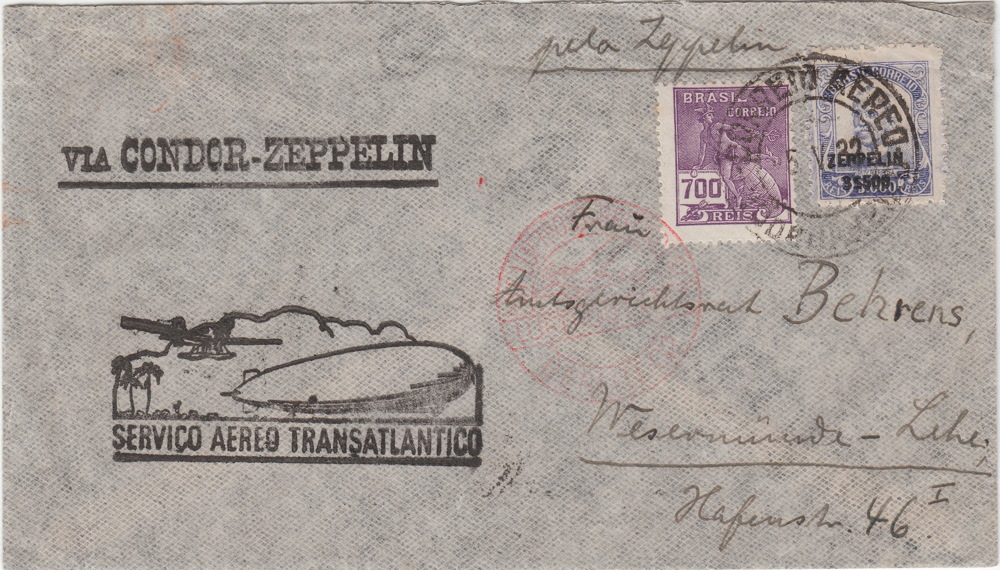 Dieser am 05.05.1932 in Rio de Janeiro aufgegebene Brief lief als Zuleitungspost für die 4. Südamerikafahrt von LZ 127 GRAF ZEPPELIN, zu der das Luftschiff am 07.05.1932 um 02:18 Uhr in Recife startete und am 10.05.1932 um 12:46 Uhr in Friedrichshafen landete: