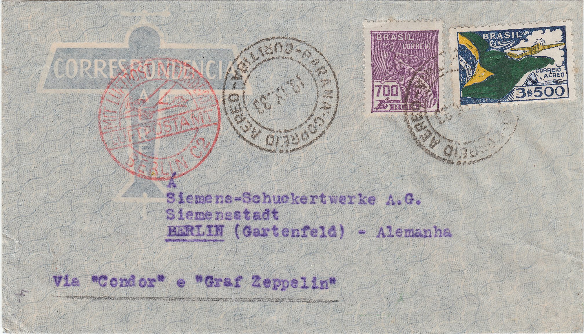 Dieser Beleg wurde als Zuleitungspost zur 7. Südamerikafahrt 1933 des Luftschiffes GRAF ZEPPELIN am 19.09.1933 in CURITIBA, der Hauptstadt des brasilianischen Bundesstaates Paraná, aufgegeben::