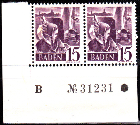 Eckrandpaar vom linken unteren Bogenrand. Unterhalb dieser beiden Marken befindet sich bei kleinformatigen Marken der Französischen Zone immer die Bogenzählnummer. Vorangestellt ist jeweils der Buchstabe A oder B zur Unterscheidung der jeweils nebenander gedruckten Bogenpaare. Hier handelt es sich um den rechten Bogen, der jeweils der "B"-Bogen ist.