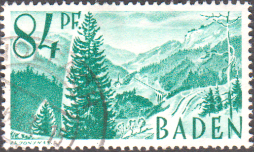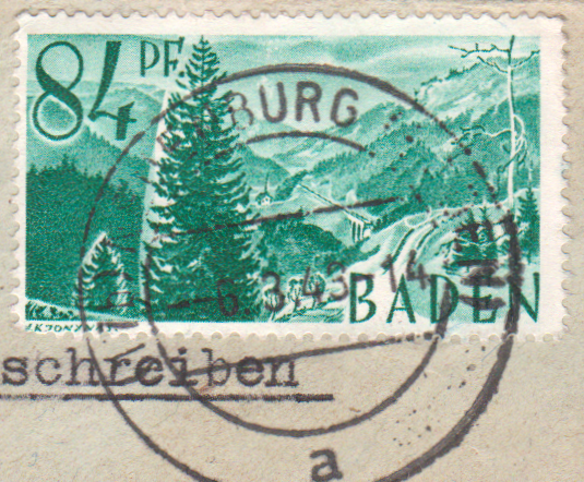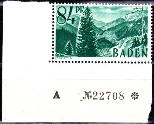 Eckrandstück vom linken unteren Bogenrand. Unterhalb dieser Marke befindet sich bei Marken im Großformat der Französischen Zone immer die Bogenzählnummer. Vorangestellt ist jeweils der Buchstabe A oder B zur Unterscheidung der jeweils nebenander gedruckten Bogenpaare. Hier handelt es sich um den linken Bogen, der jeweils der "A"-Bogen ist.