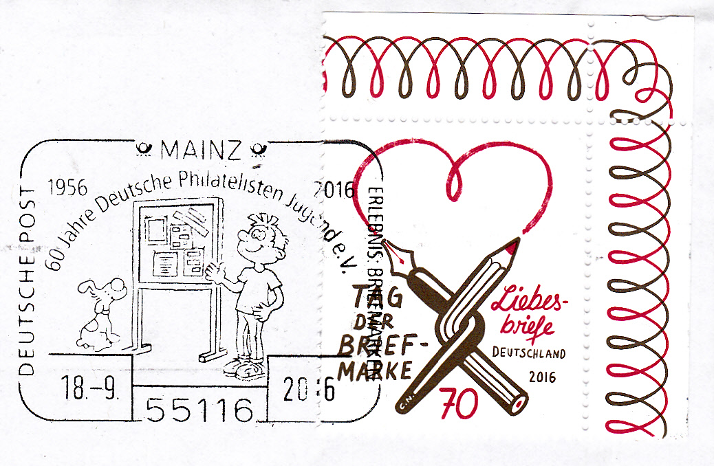 Blanko-Ganzsache der Deutschen Post AG mit einem Zudruck und dem Sonderstempel vom 18.9.2016 aus Mainz zum Jubiläum "30 Jahre Deutsche Philatelisten Jugend".