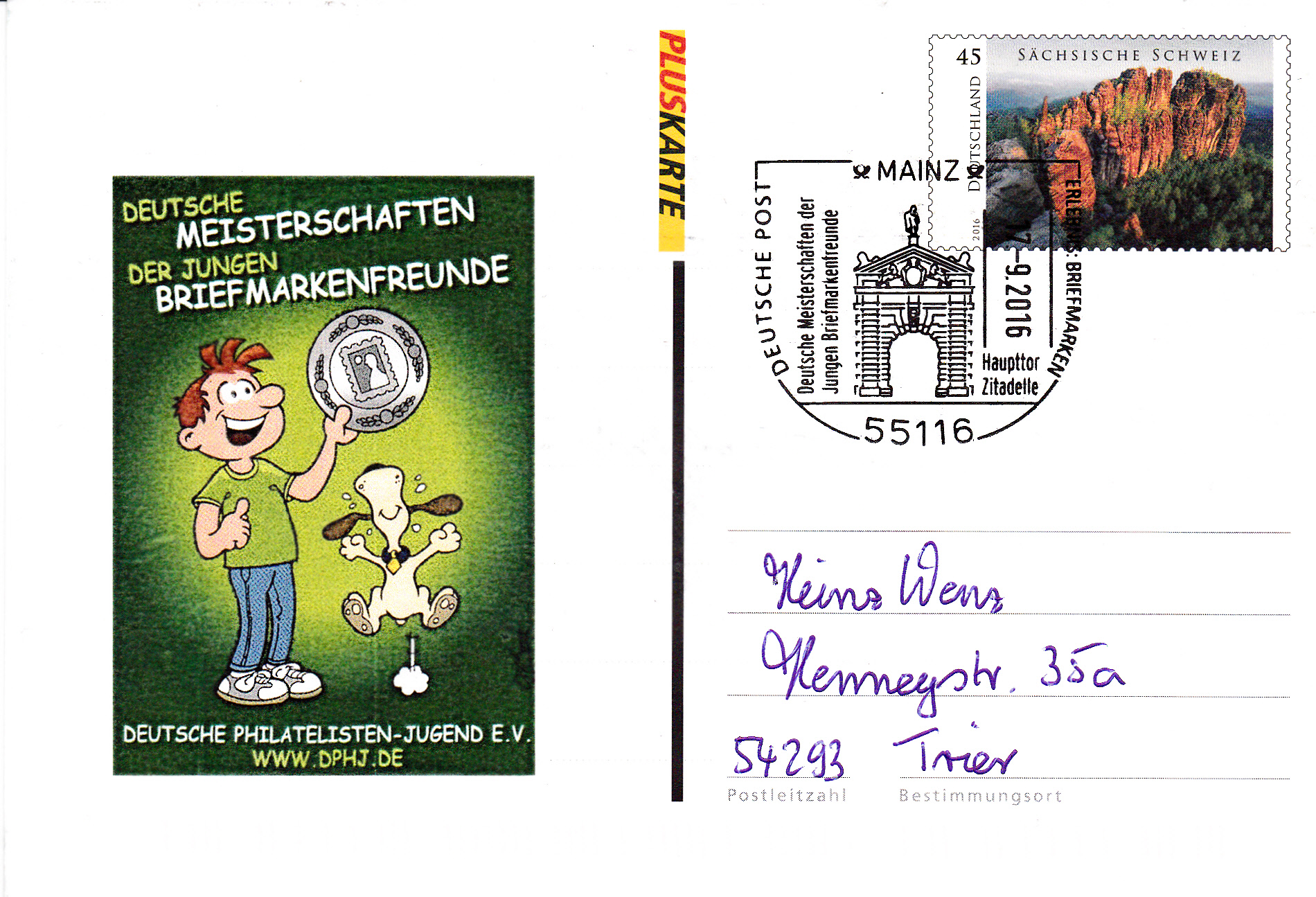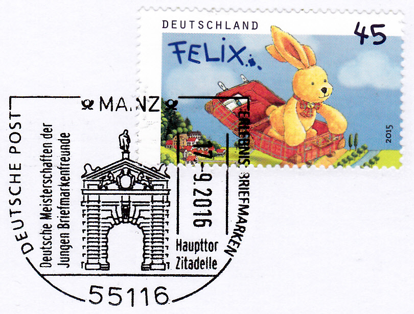 Blanko-Ganzsache der Deutschen Post AG mit einem Zudruck und dem Sonderstempel vom 17.9.2016 aus Mainz zur "Deutschen Mannschaftsmeisterschaften der Jungen Briefmarkenfreunde".