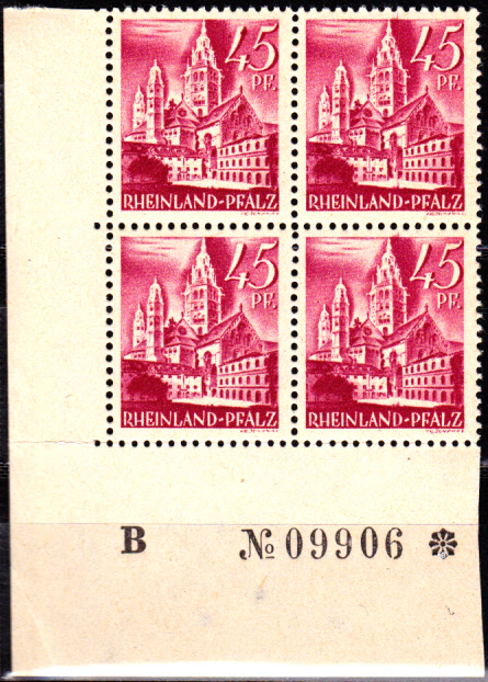 Eckrandviererblock vom linken unteren Bogenrand. Unterhalb der beiden linken Marken befindet sich bei kleinformatigen Marken der Französischen Zone immer die Bogenzählnummer. Vorangestellt ist jeweils der Buchstabe A oder B zur Unterscheidung der jeweils nebenander gedruckten Bogenpaare. Hier handelt es sich um den rechten Bogen, der jeweils der "B"-Bogen ist.