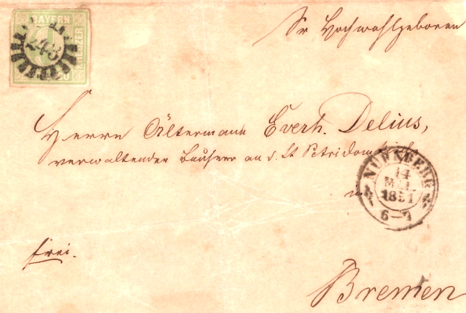 Das ist eine Bayern MiNr. 5, gebraucht am 14.05.1851 als Einzelfrankatur auf einem Brief von Nürnberg nach Bremen.