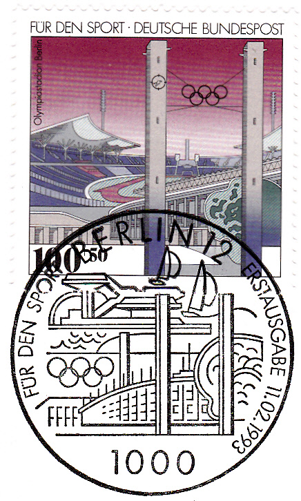Auf der Marke zu 100Pf+50Pf aus der Serie "Für den Sport" 1993 der Deutschen Bundespost (MiNr 1652) und im unteren Teil des dazu passenden Ersttagsonderstempel aus Berlin wird jeweils das Olympiastadion berlin bei den Olympischen Sommerspielen 1936 gezeigt.