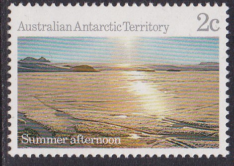Der 2 Cent-Wert (MiNr 74) aus der am 11. März 1987 erschienenen Freimarkenserie "Landschaften" zeigt im Motiv einen Sommernachmittag bei der Mawson-Station.