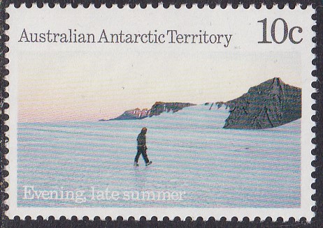 Der 10 Cent-Wert (MiNr 75) aus der am 11. März 1987 erschienenen Freimarkenserie "Landschaften" zeigt im Motiv einen Spätsommerabend in Mac-Robertson-Land.