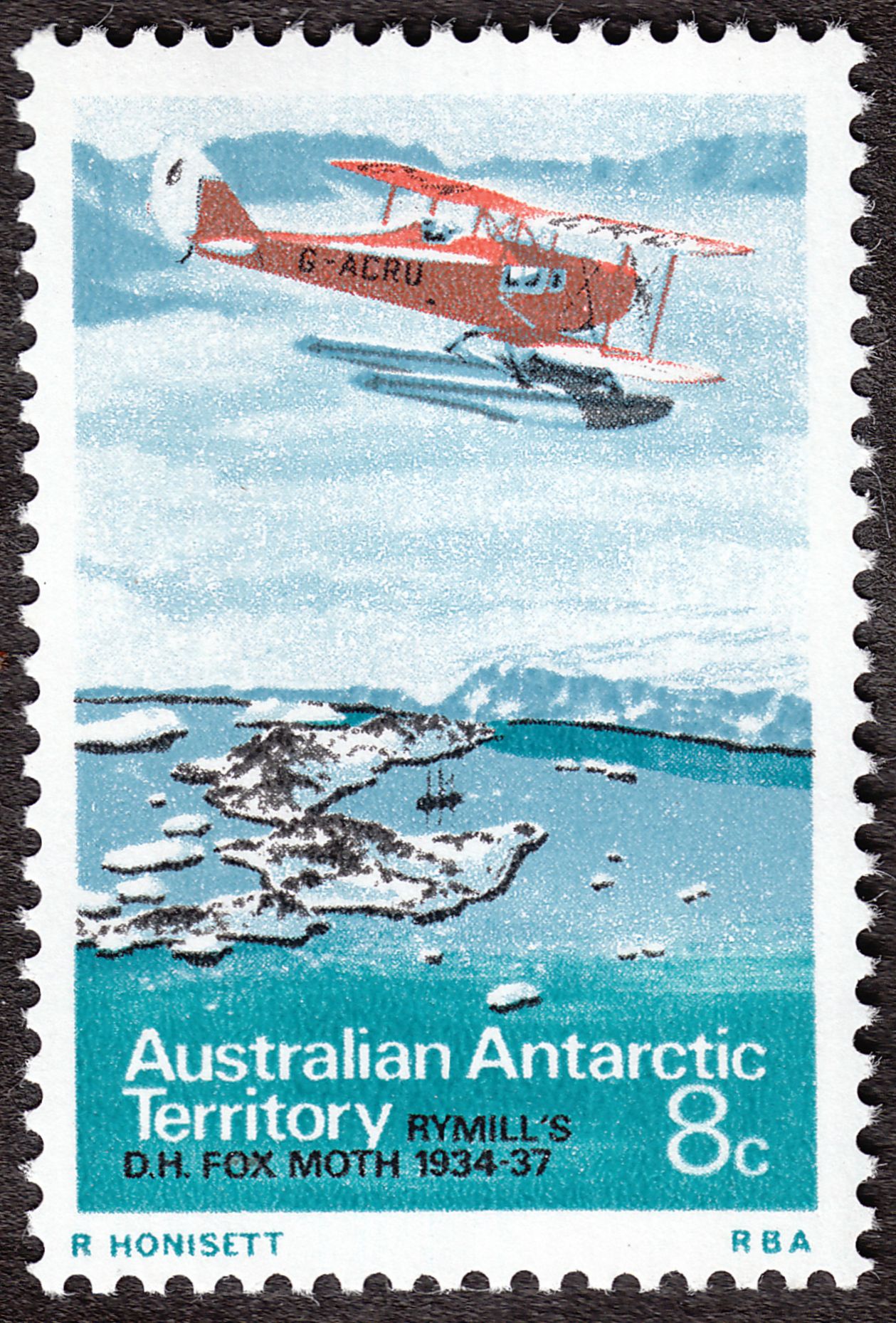 Diese Marke zu 5 Cents zeigt eine De Havilland DH60G als Maschine von Sir Douglas Mawson "MAWSON'S D.H. GIPSY MOTH 1931" mit der Kennung "VH-ULD":