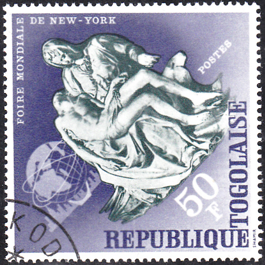 In Togo erschien zu dieser Weltausstellung eine Serie mit fünf Marken. Hier die Marke zu 5 Fr (MiNr 477 A) mit einer Unisphäre und der Skyline von New York.